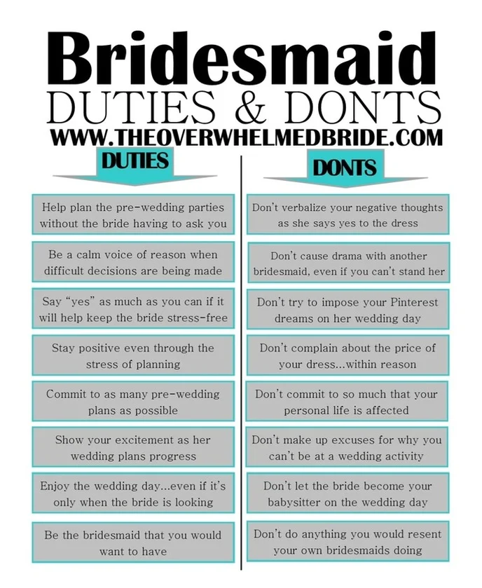 So today we are talking about bridesmaids. Now, don't just go and hand this visual to your bridesmaid before reading all the way through because I am talking to you too!! Yes, I made this one for your bridesmaids, but more specifically for you, the bride! So many brides come to me, frustrated that their bridesmaids aren't doing everything they ask of them. "Can I just kick her out of the wedding party??"And I always have to be honest, oftentimes that is on you. A bridesmaid is not your servant - she is not there to plan your wedding for you and to put together every single DIY craft you have in mind. Yes, it is an honor to be asked to be a bridesmaid but let's be honest, she has a life outside of your wedding too!