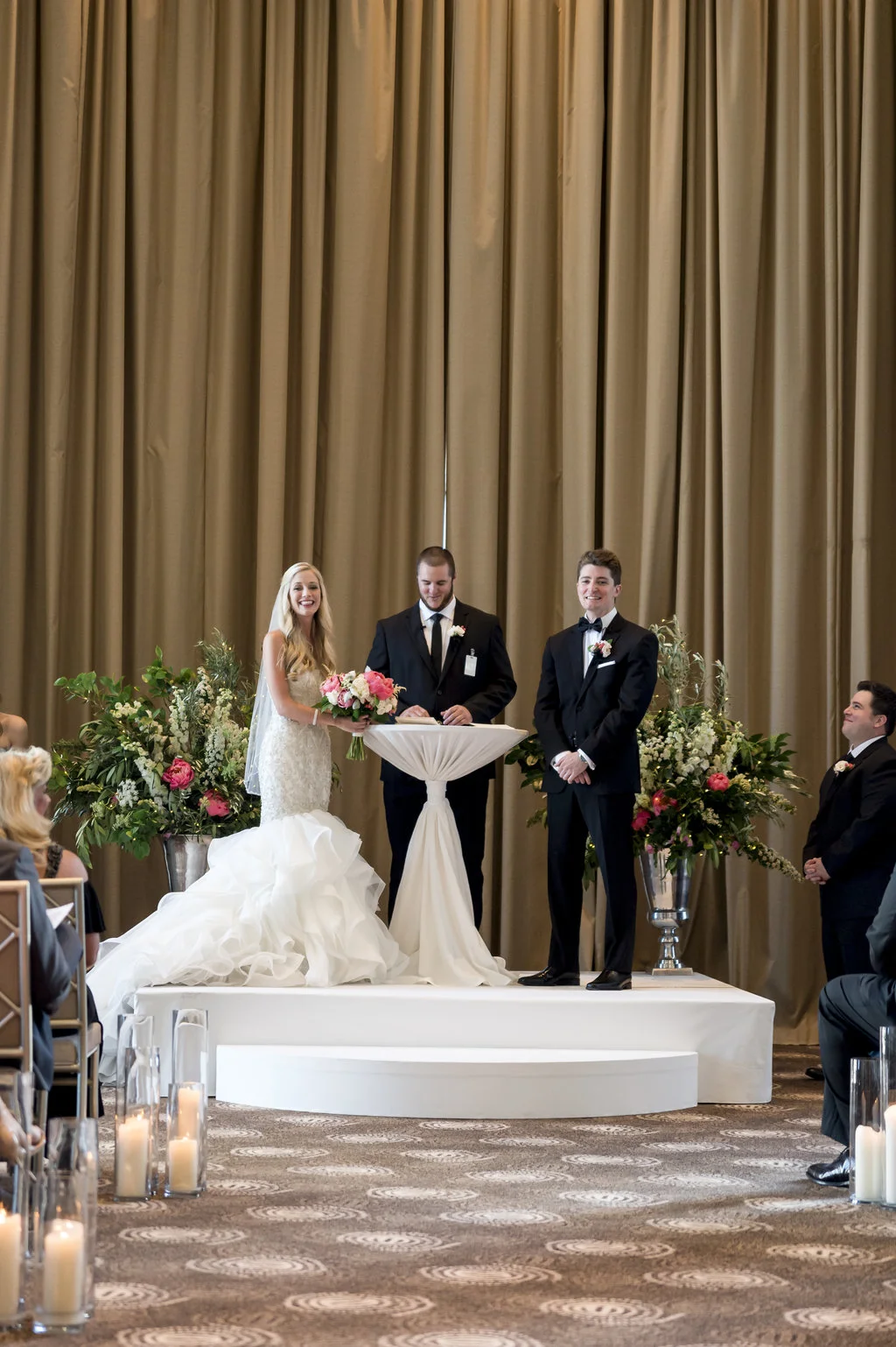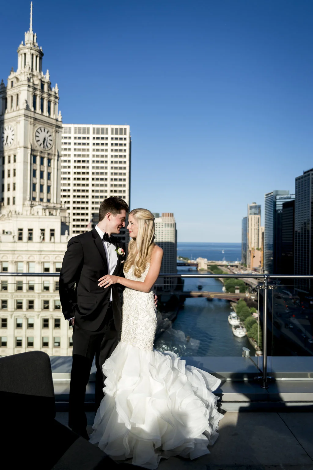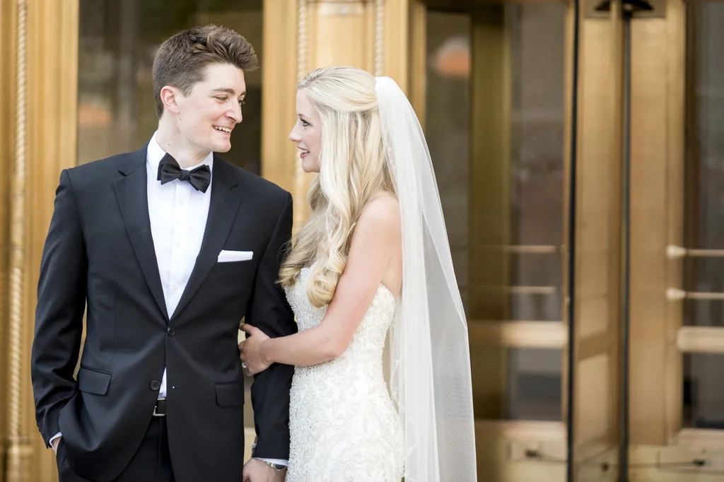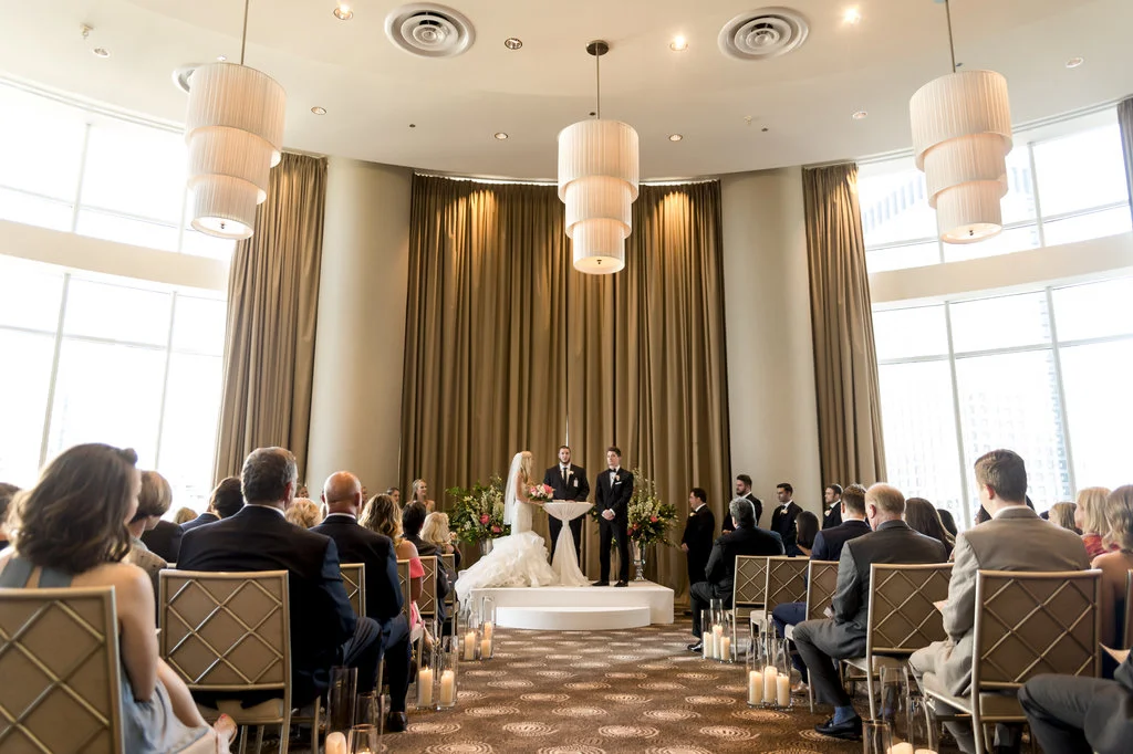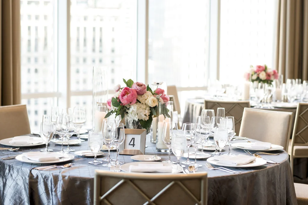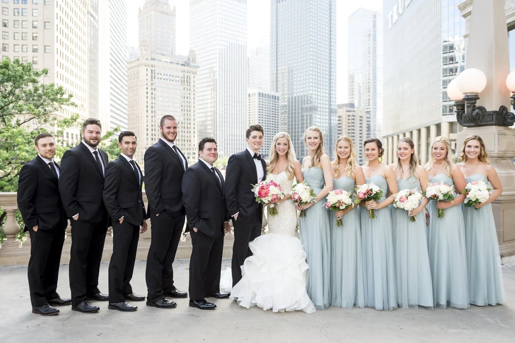 “An intimate affair of under 100 guests, Chelsea and Kevin’s Chicago summer wedding was nothing short of timeless and sentimental. The couple tied the knot at The Trump Tower in Chicago and followed with a reception at the same location. The overall wedding aesthetic centered around their dusty blue, pink and white color palette and when asked to describe her wedding, the bride described it as classic and elegant.”