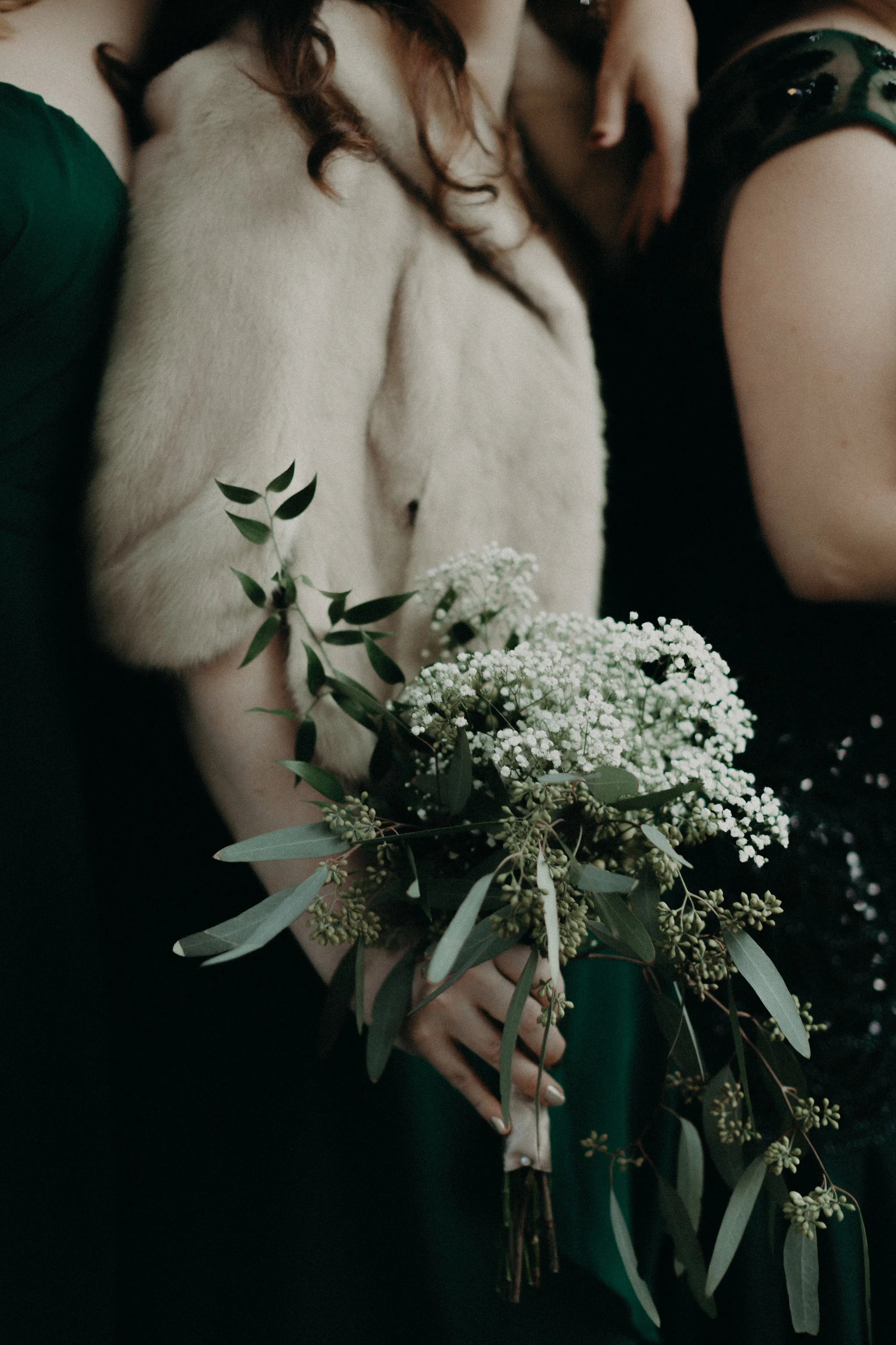 “Our wedding was 15 years in the making, but definitely worth the wait! We knew it was going to be small because we wanted it to be here in Indianapolis - our home for the last 11 years. Our goal was cozy and intimate and a little bit "not the norm". We opted to plan most of it ourselves since it was only going to be around 50 people or so, but let me tell ya, we wish we would have hired a planner! With that being said, I wouldn't have changed a thing. The theme was Winter Art Deco and since we were having it at the Speak Easy Downtown, this fit in perfectly with our ambience and decor — warm, gold tones, low-lighting, candles, and a little bit of winter greenery for color. My friend, Robyn, helped design the table centerpieces as well as all of the flowers for the wedding!”