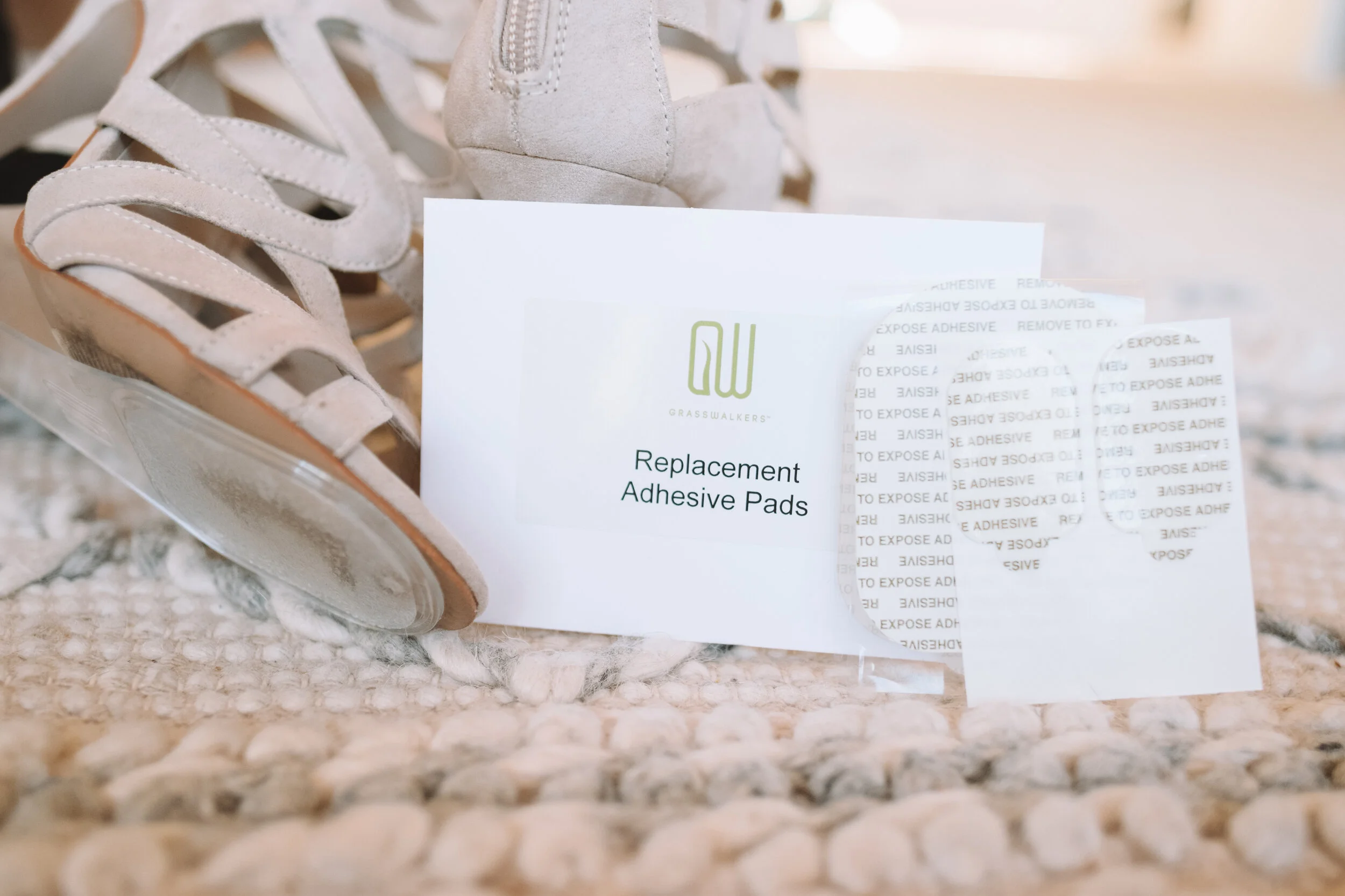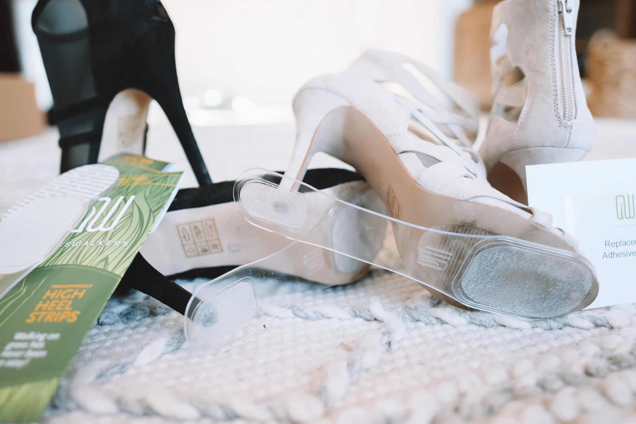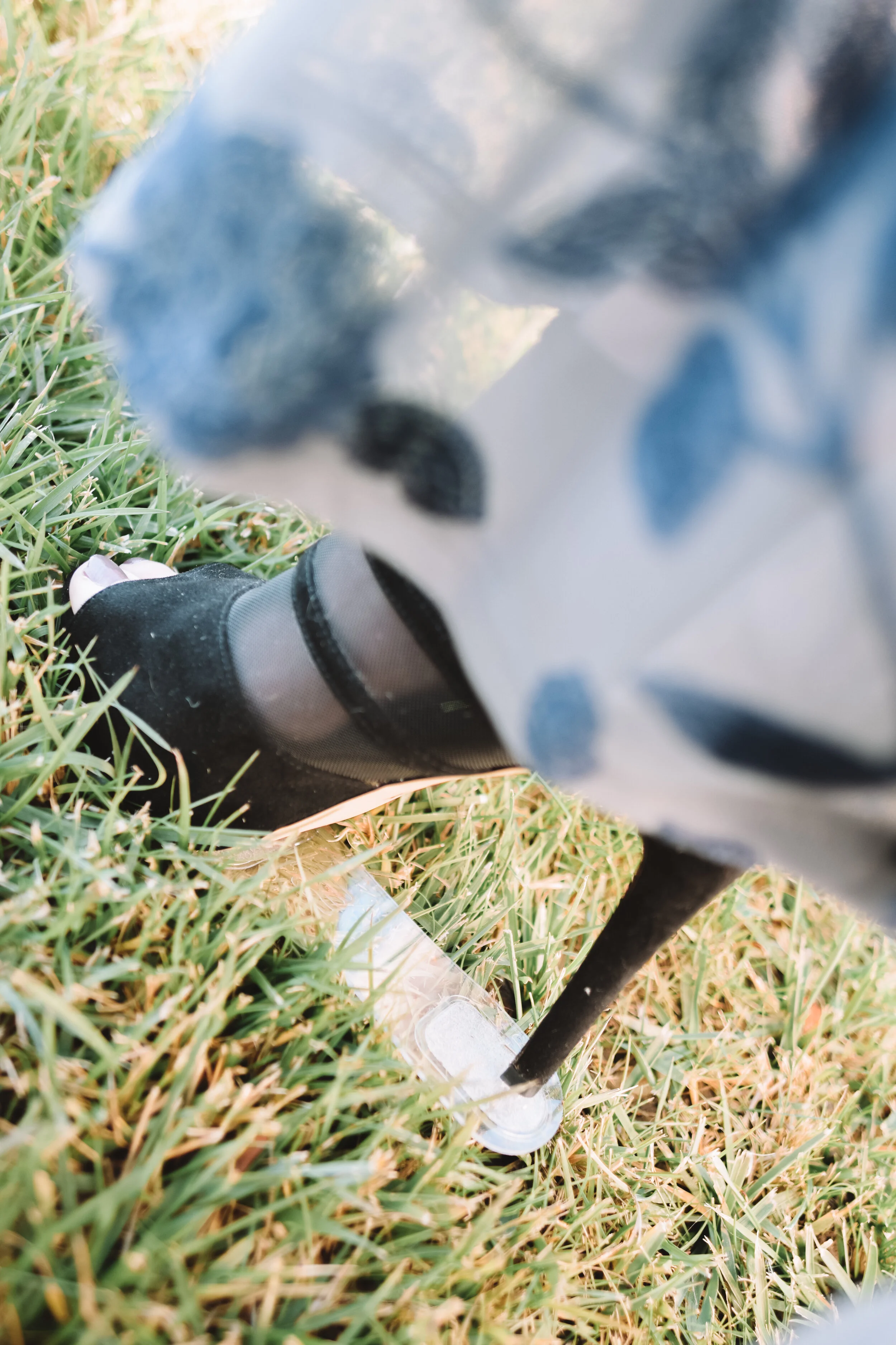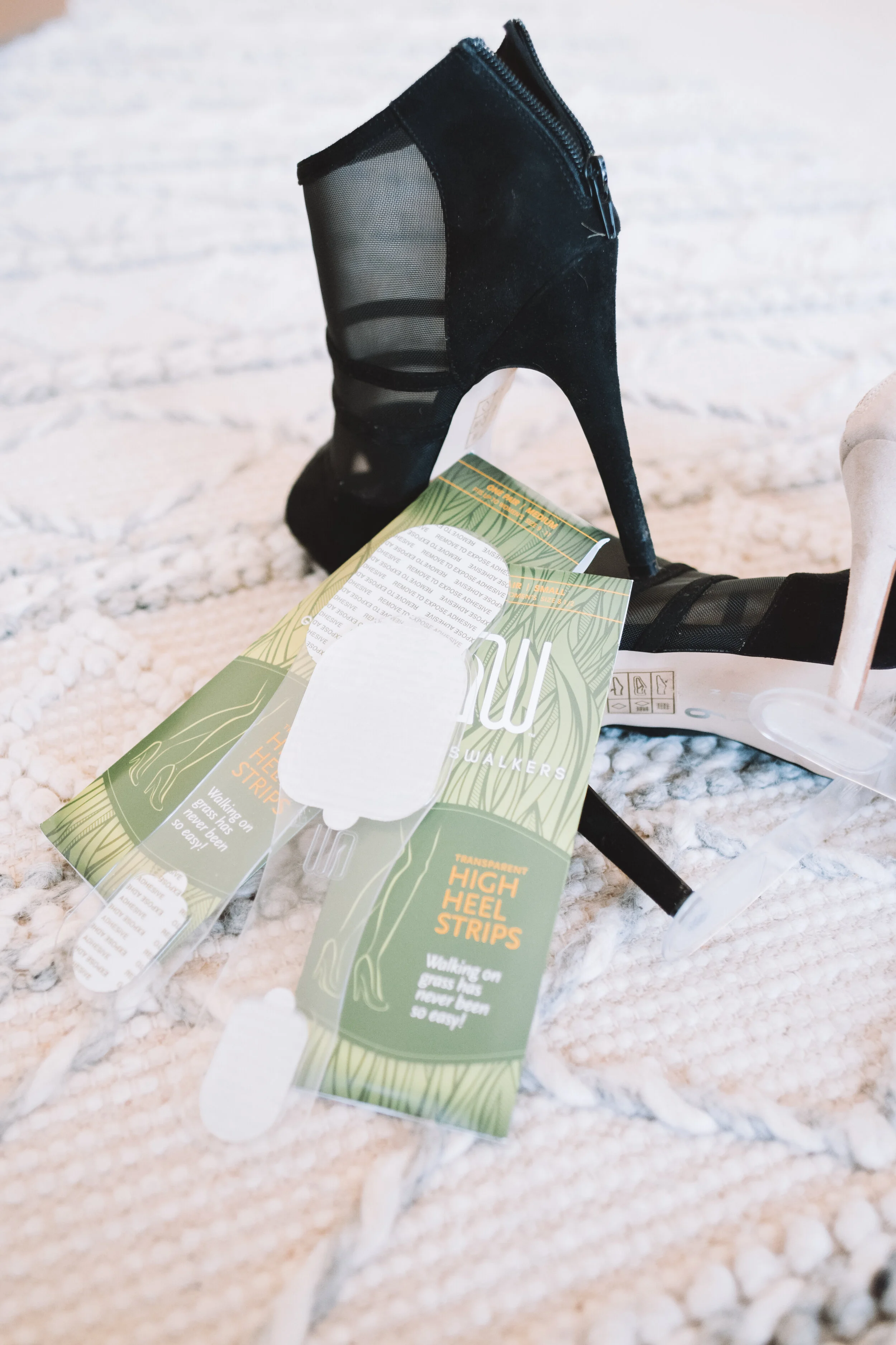 Grasswalkers are a clear piece of plastic with adhesive on either end. Stick them right on your heels within seconds and voila — you can easily walk on the grass and in the first without getting stuck or destroying those beautiful heels you just bought!