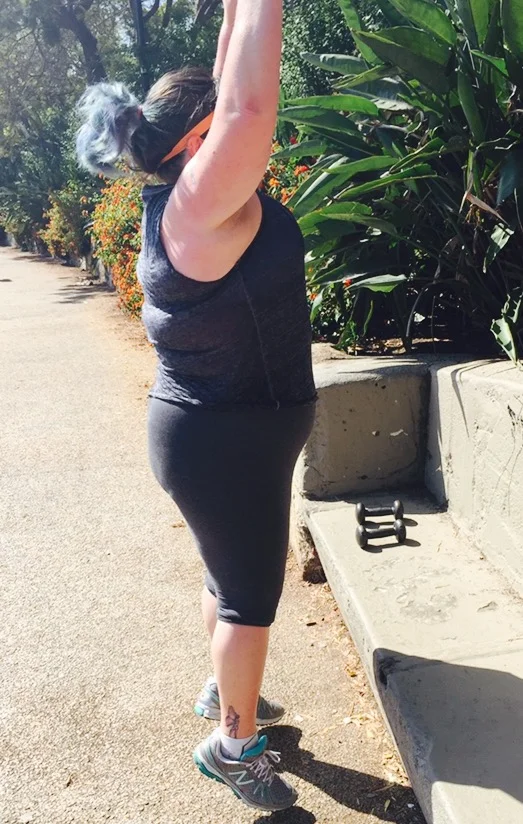 I don’t really have a creative name for this super-effective exercise besides describing how to do it! Again, you don’t need weights but you will feel more of a burn using at least 5 pounders.