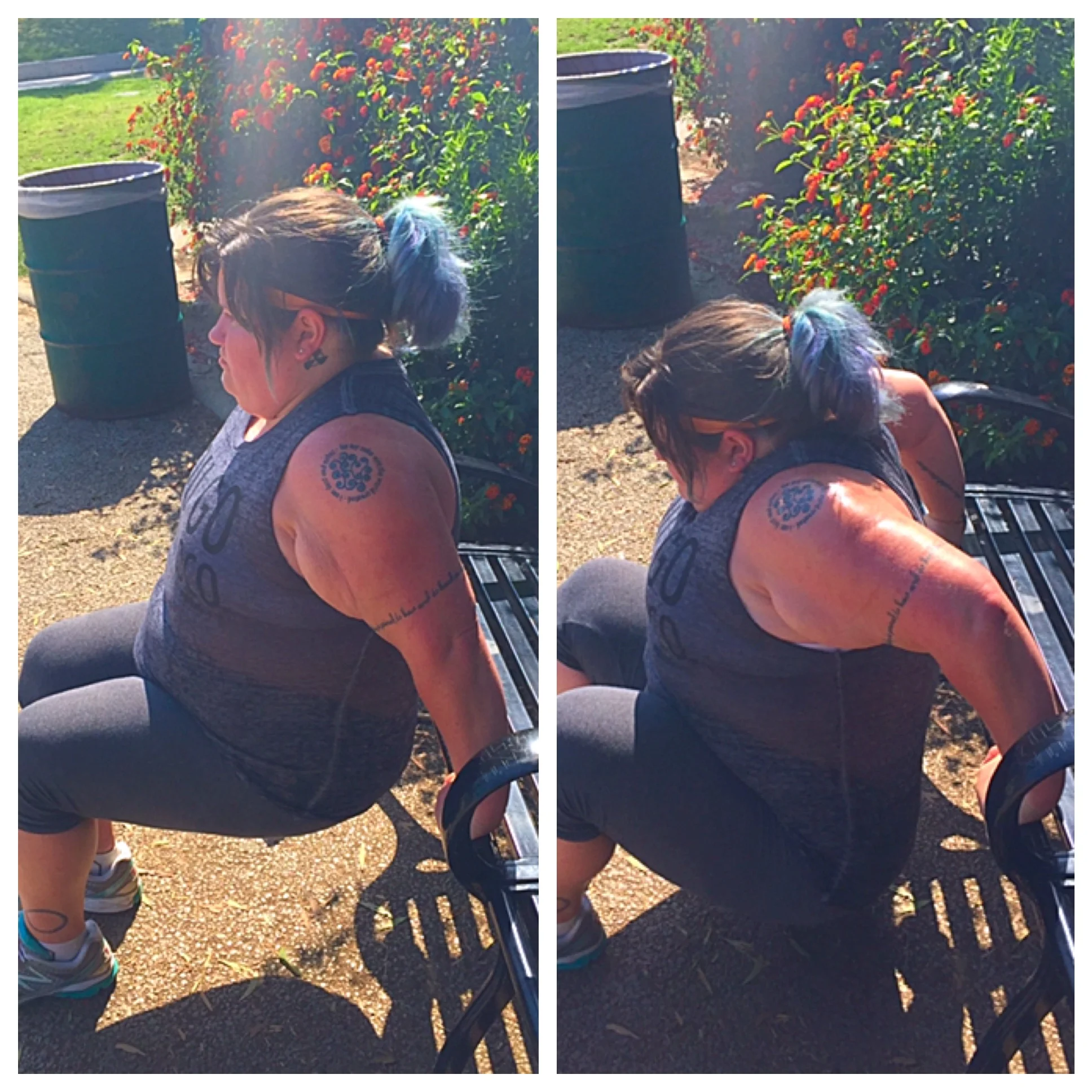 Start by sitting on a bench. Easy enough? Slide your butt out so it’s off the bench and your arms are holding you up. Your legs should be straight out. However, if you find this too hard at first you can do a modified version by bending your knees and keeping your feet flat on the floor (like our lovely model Jessa in the picture). Once your feet are in place, bend your arms keeping your elbows back, and push back up. Try to do 3 sets 12-15 repetitions and your triceps will be on fire!!