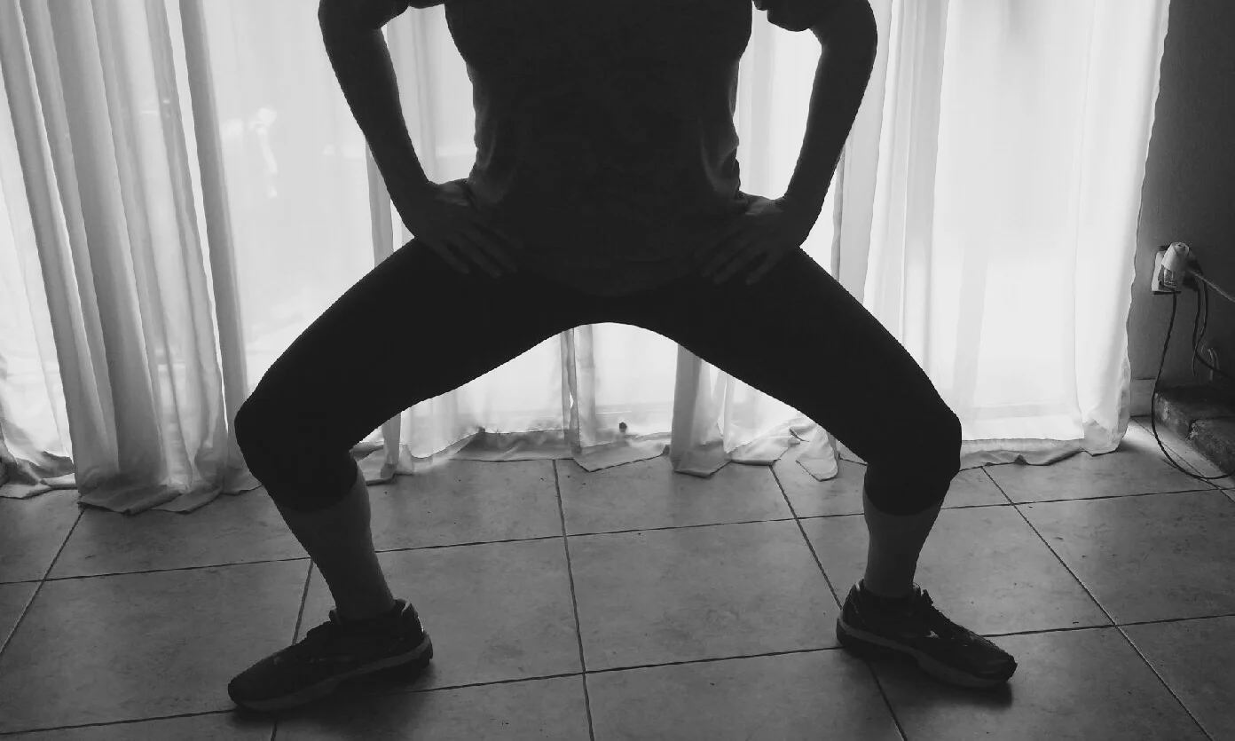 Feet turned out in a wide stance, squat while keeping your back straight. Once you feel a stretch in your inner thighs come all the way up from the squat and straighten your legs. If you notice your knees passing your toes when you squat, try to widen your stance a little bit more. Repeat 15 times.