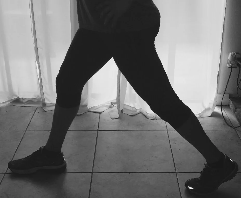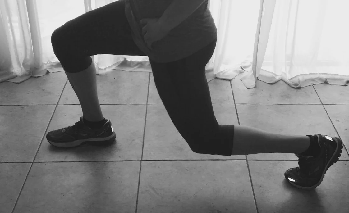 Take a big step forward and bend your knees so the back one is almost touching the floor and the front knee is not passing your toe five times up and down. After the fifth bring your front foot back to the starting position and alternate legs. Repeat 5 times each leg.