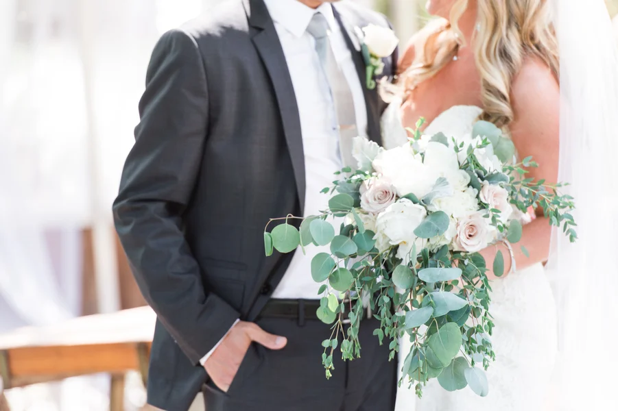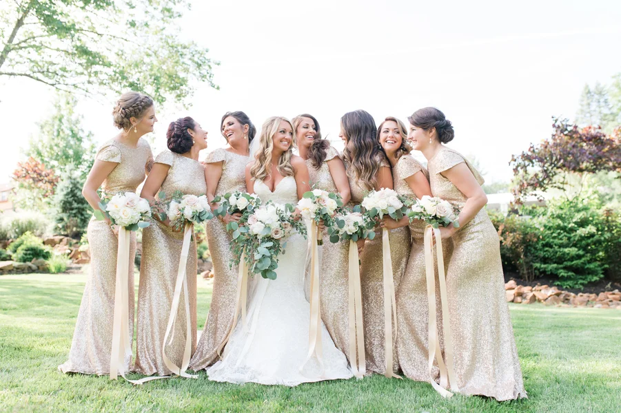 We walked around the property and took lots of photos of the couple before the bridal party joined us. The bridesmaids looked stunning in their gold Sorella Vita sequin gowns! The bouquets were gorgeous (I was a bit obsessed), with peonies, roses, hydrangeas, lots of hanging eucalyptus, and were finished off with long satin ribbon (my fave!!!)
