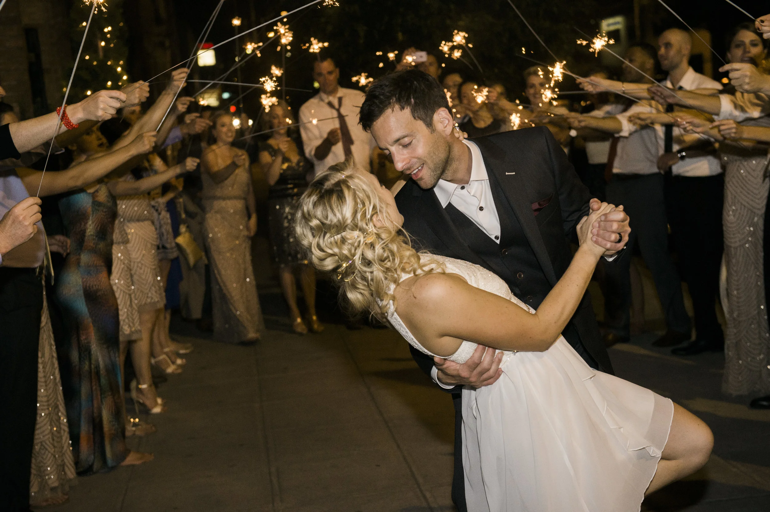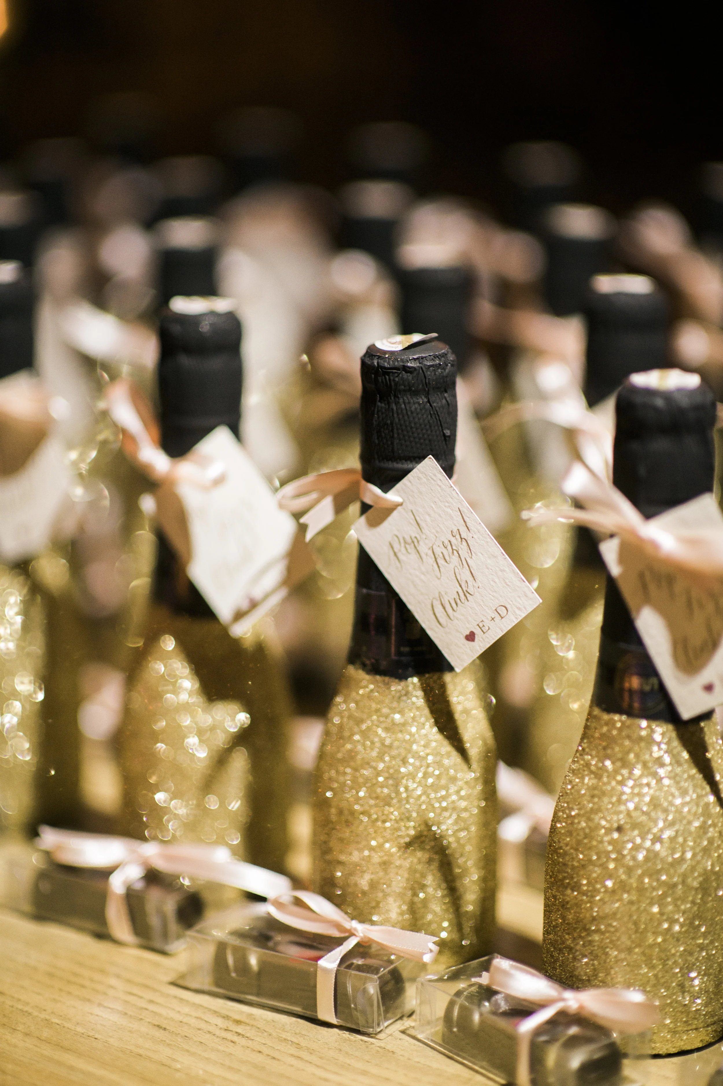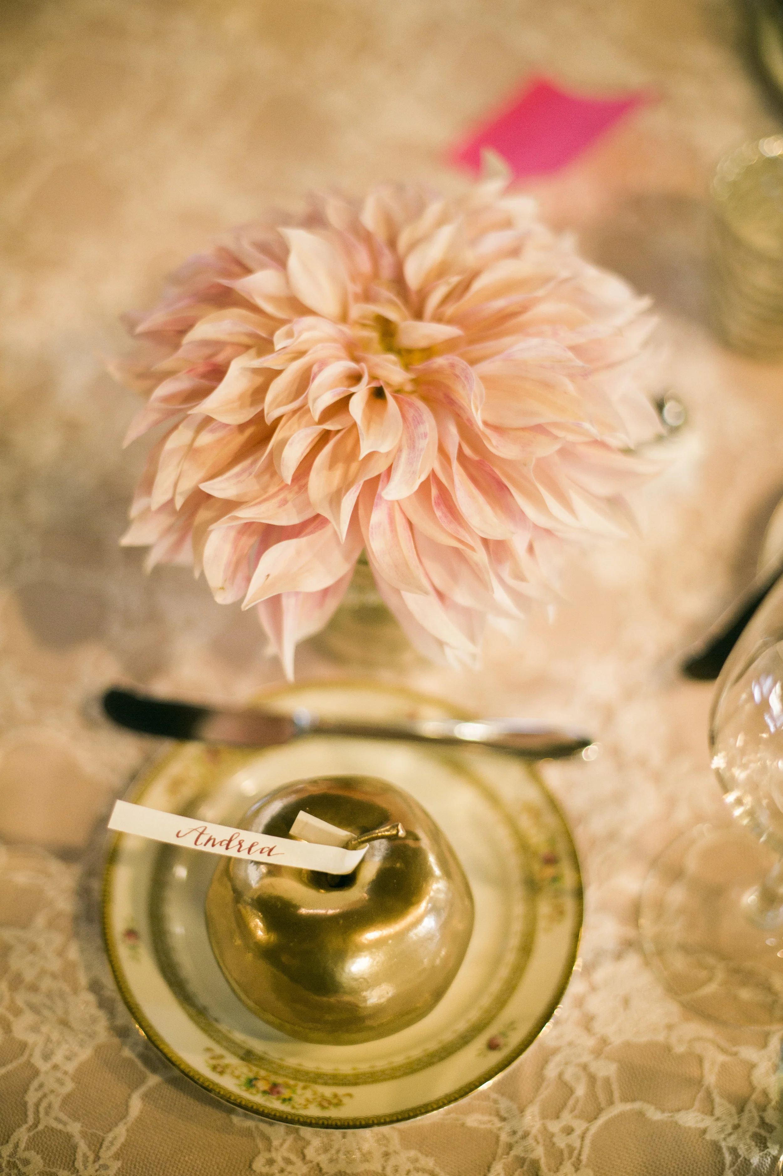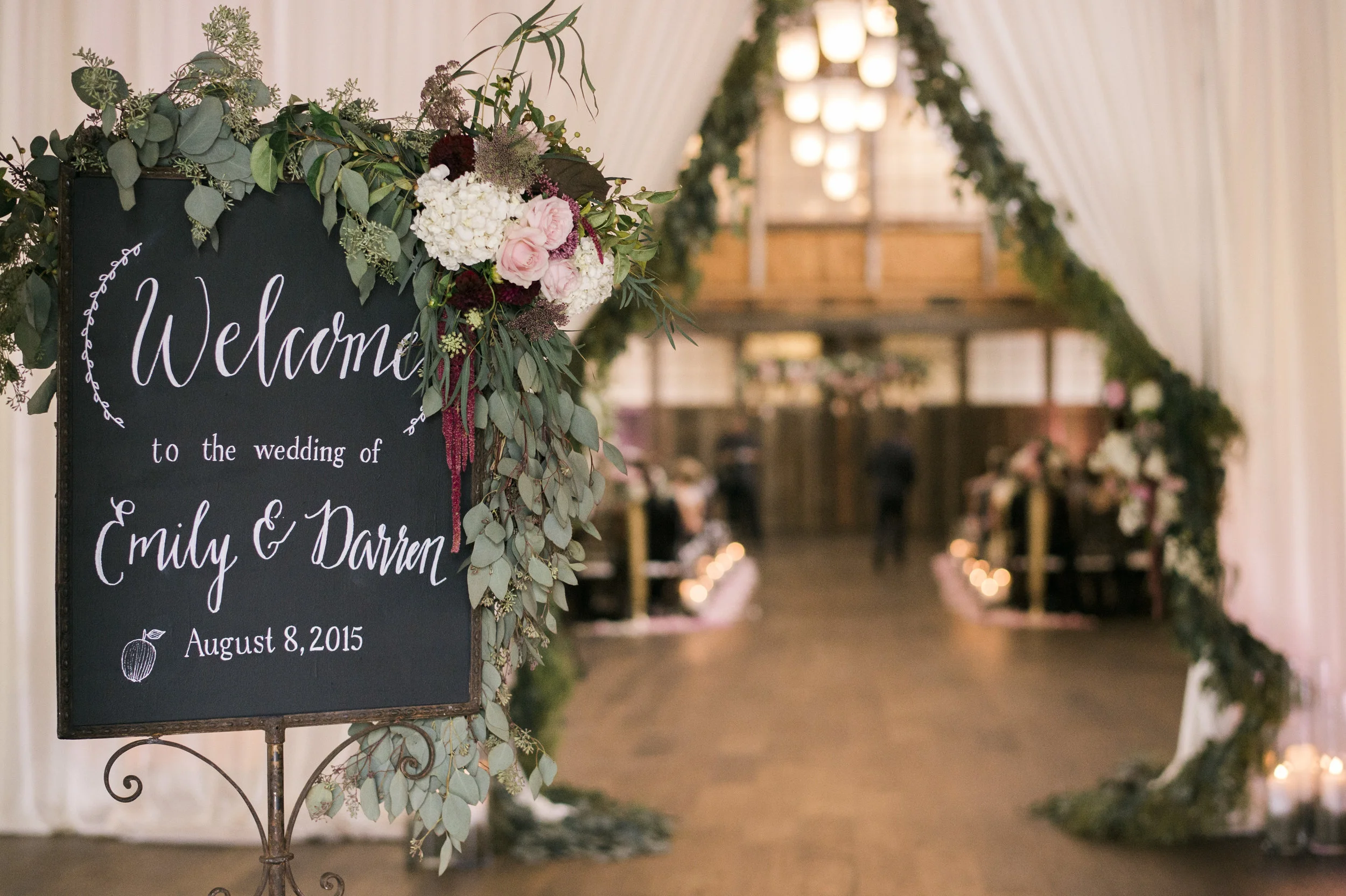 Thoughtful personal touches were included in all aspects of their event design, including having a portion of the music score from the song that Darren wrote for Emily printed on the back of the program that was given to guests. Gold apples were incorporated throughout the design theme to represent the groom’s last name, which means “apple” in German. The couple LOVE to enjoy cocktails at home and on their date nights, so in order to share this love of cocktails with their guests they featured a rotating specialty craft-cocktail menu that paired with the different events and food items throughout the evening. From Aperol Spritz upon arrival to Whiskey Tamarind Manhattan with dinner to a late-night Espresso Negroni, the guests sipped and savored seven specialty drinks throughout the evening!"