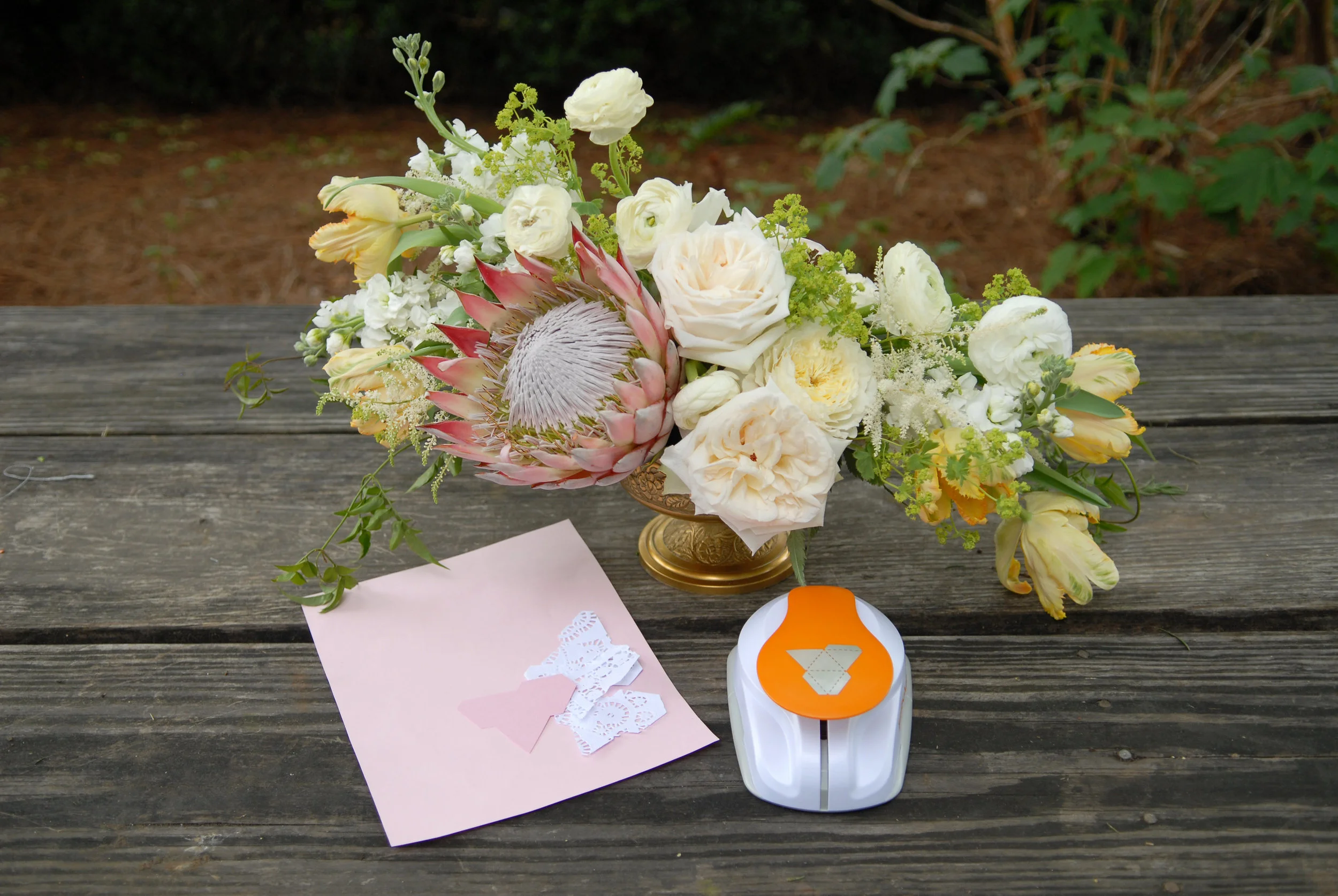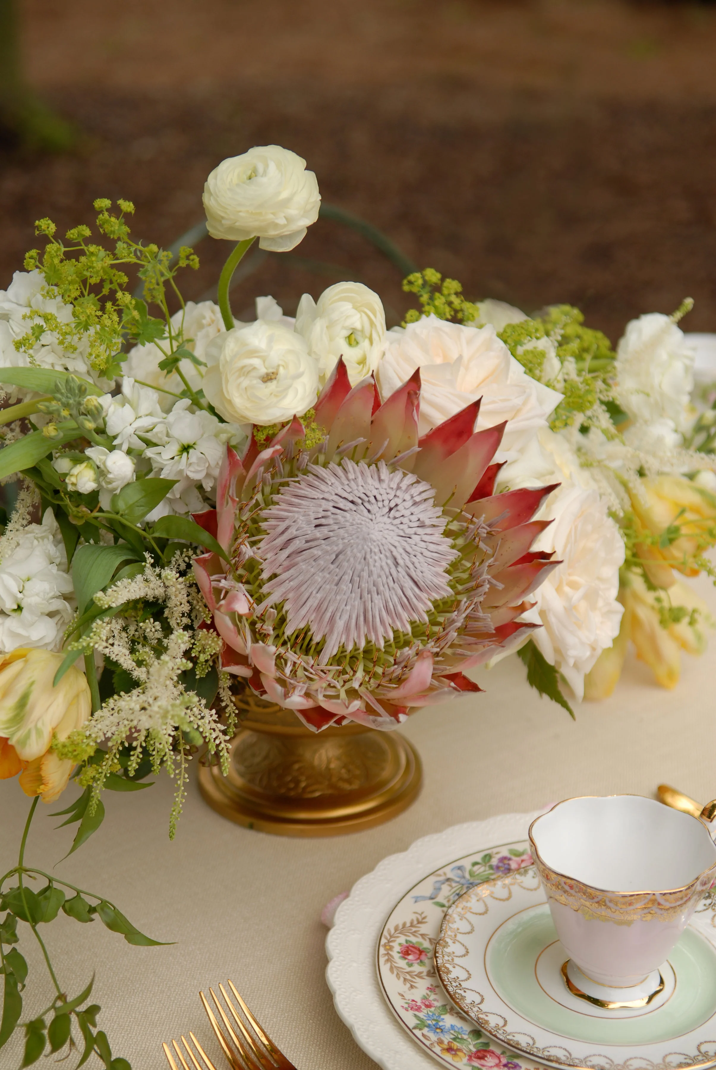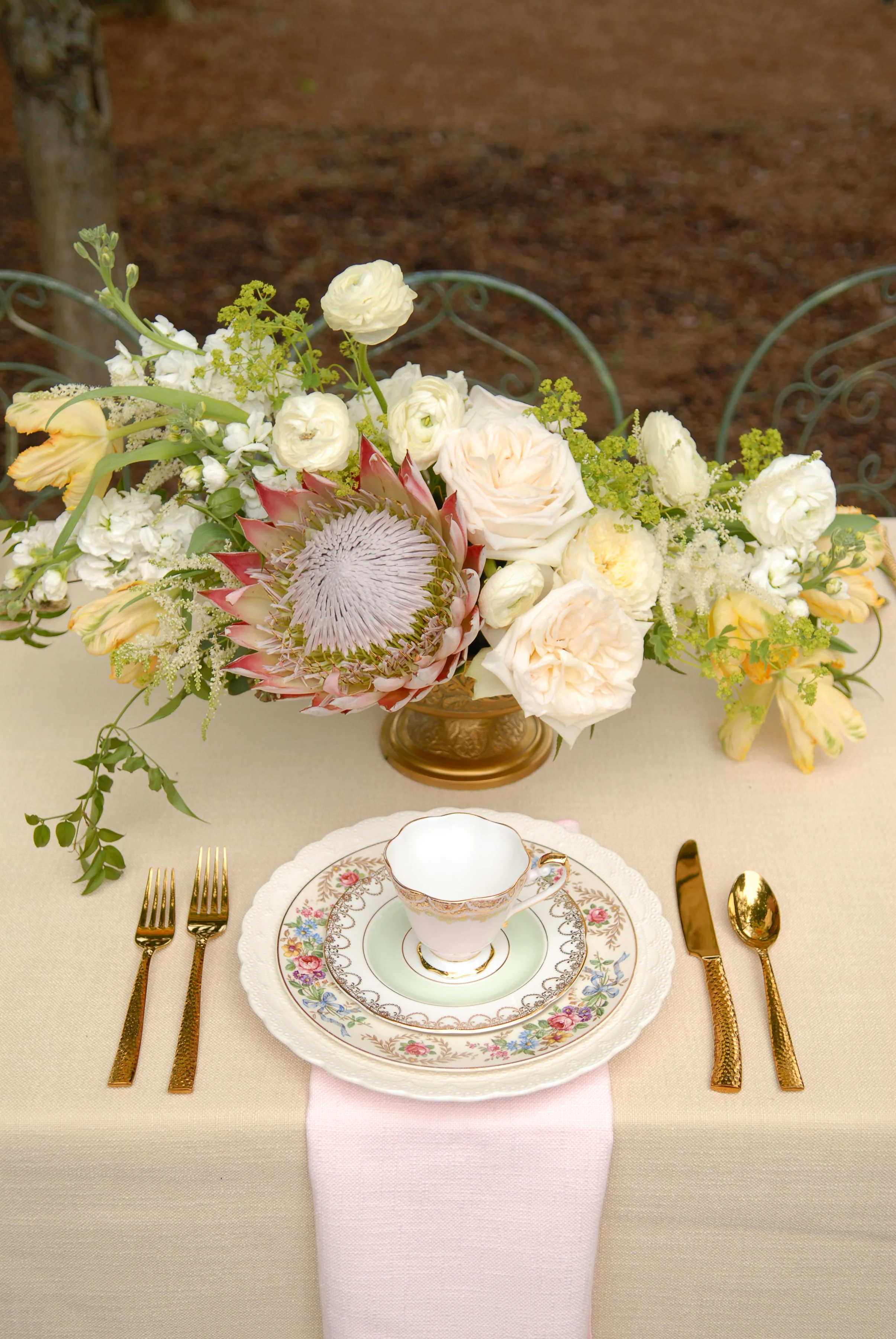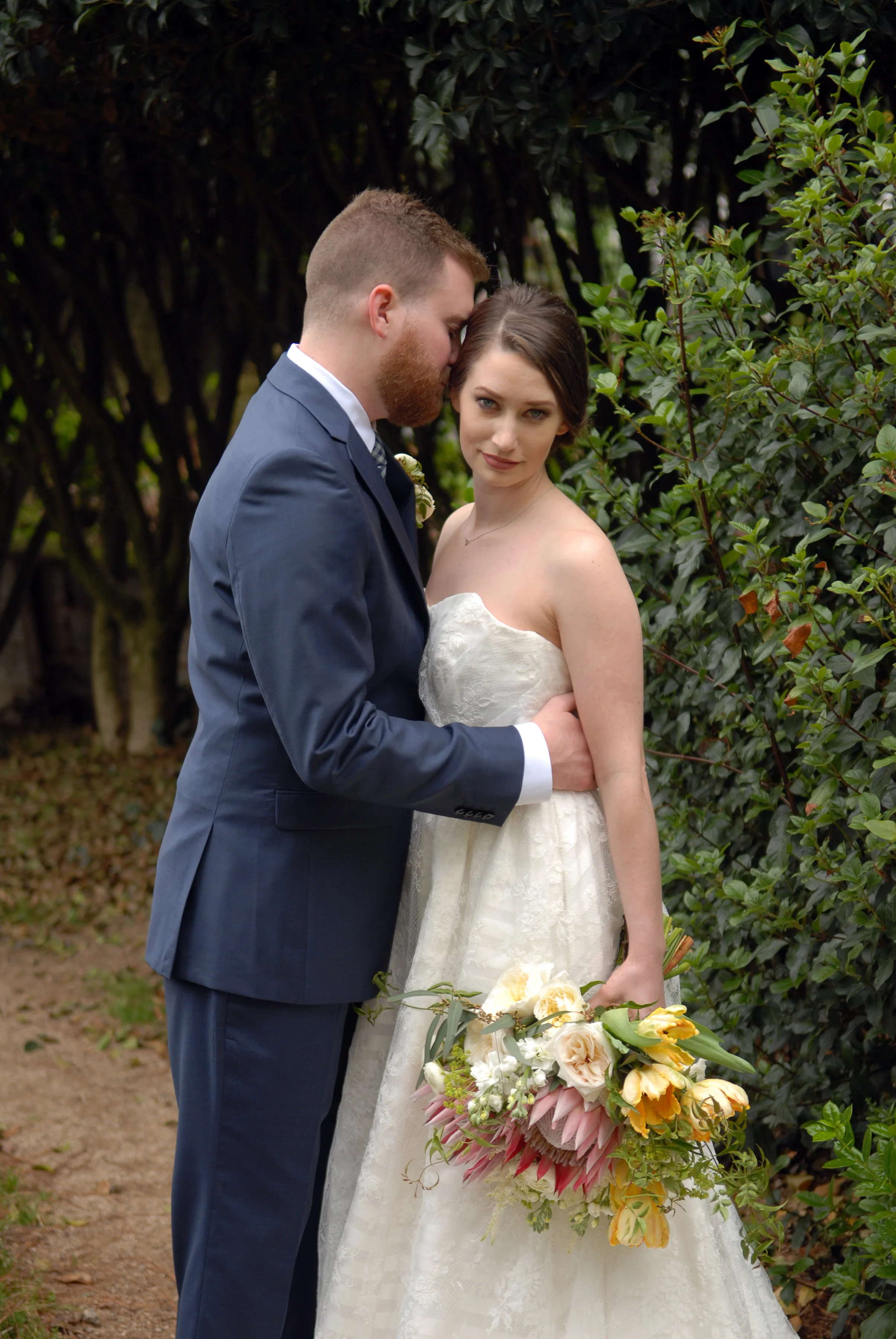 The inspiration behind this shoot was to create a timeless and romantic feel with a modern twist. I loved the thought of a secret garden setting with arbors, lace and loose florals. Touches of modern class came into play with the groom's prohibition haircut and fitted suit, and the bride's chic makeup and striped lace gown. Pulling together some of my favorite artisans to complete the look, I knew their talents would help fulfill what I was trying to accomplish.