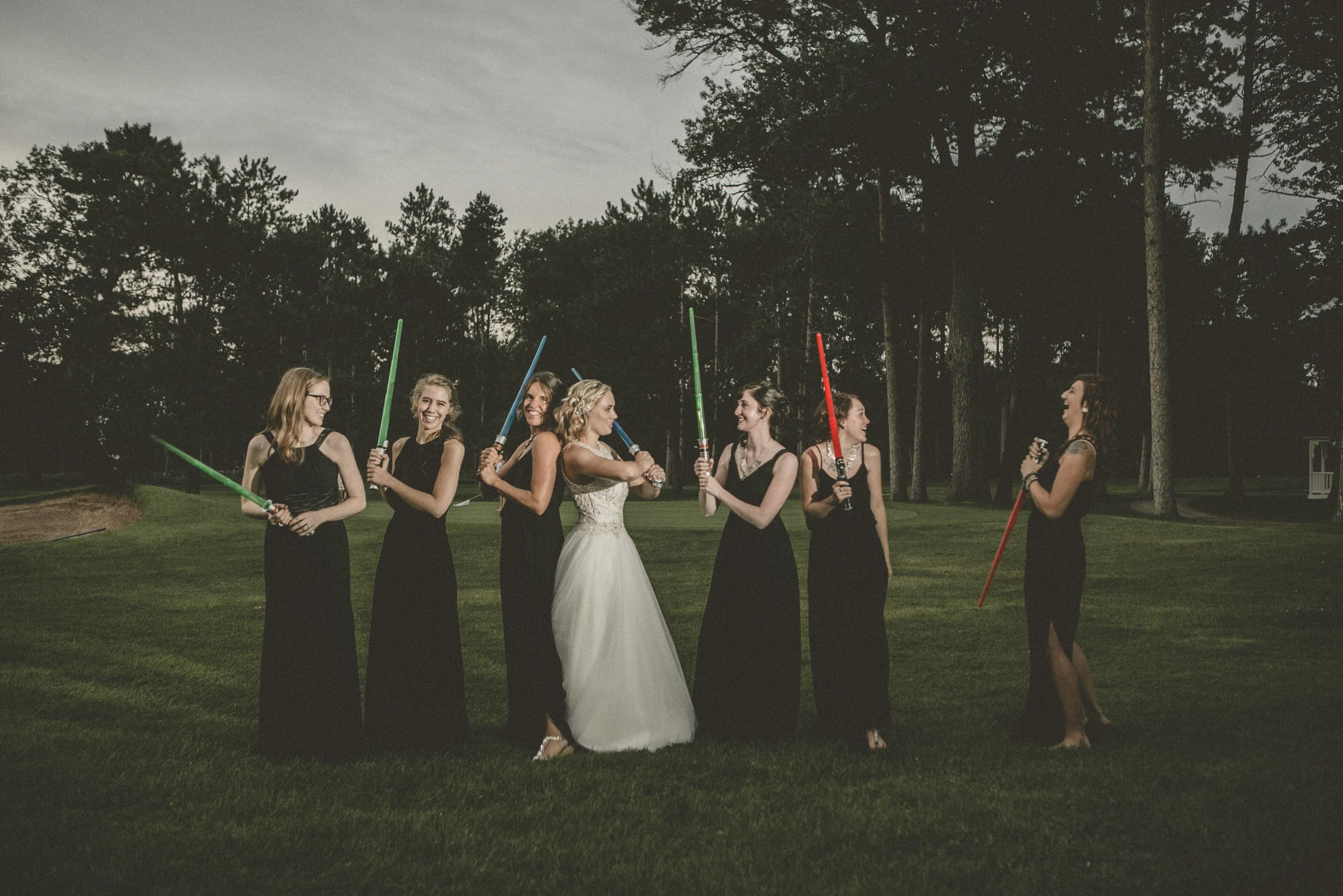 Because no wedding of theirs would be without a heroic touch, it was not surprising that the entire line of groomsmen had superhero t-shirts underneath their suits. And it was especially not a shock to anyone in attendance that light sabers were purchased specifically for an epic duel with the children in attendance.