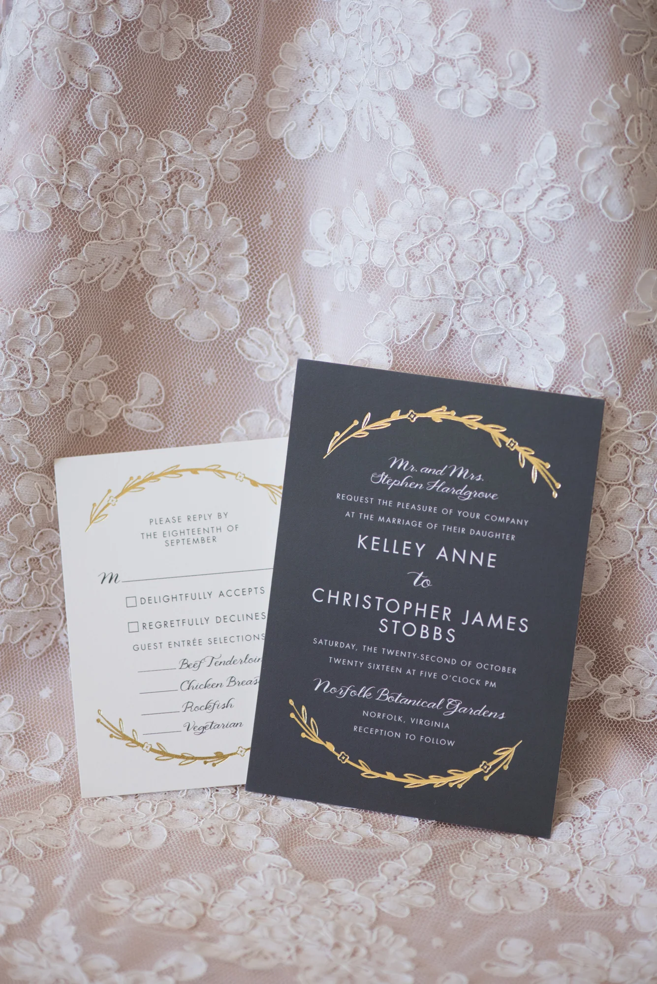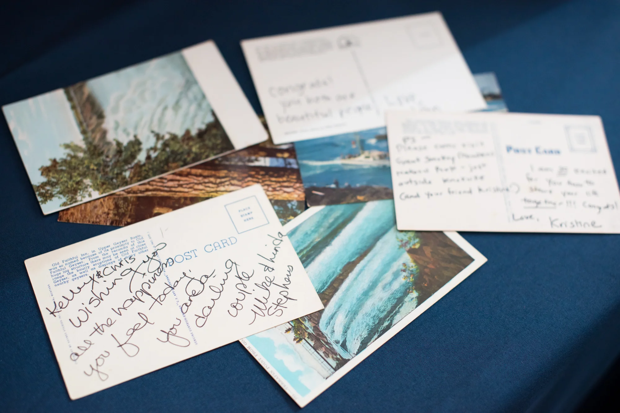Kelley created a seating chart from a world map, naming each table after places that she and Chris had either lived in or visited together. And at each place setting, a luggage tag served as both a place card and a favor. On the bag of the luggage tags were the coordinates for the wedding venue. Guests signed vintage postcards the couple had purchased online in lieu of a guestbook, placing them in a vintage suitcase for the couple to read later.