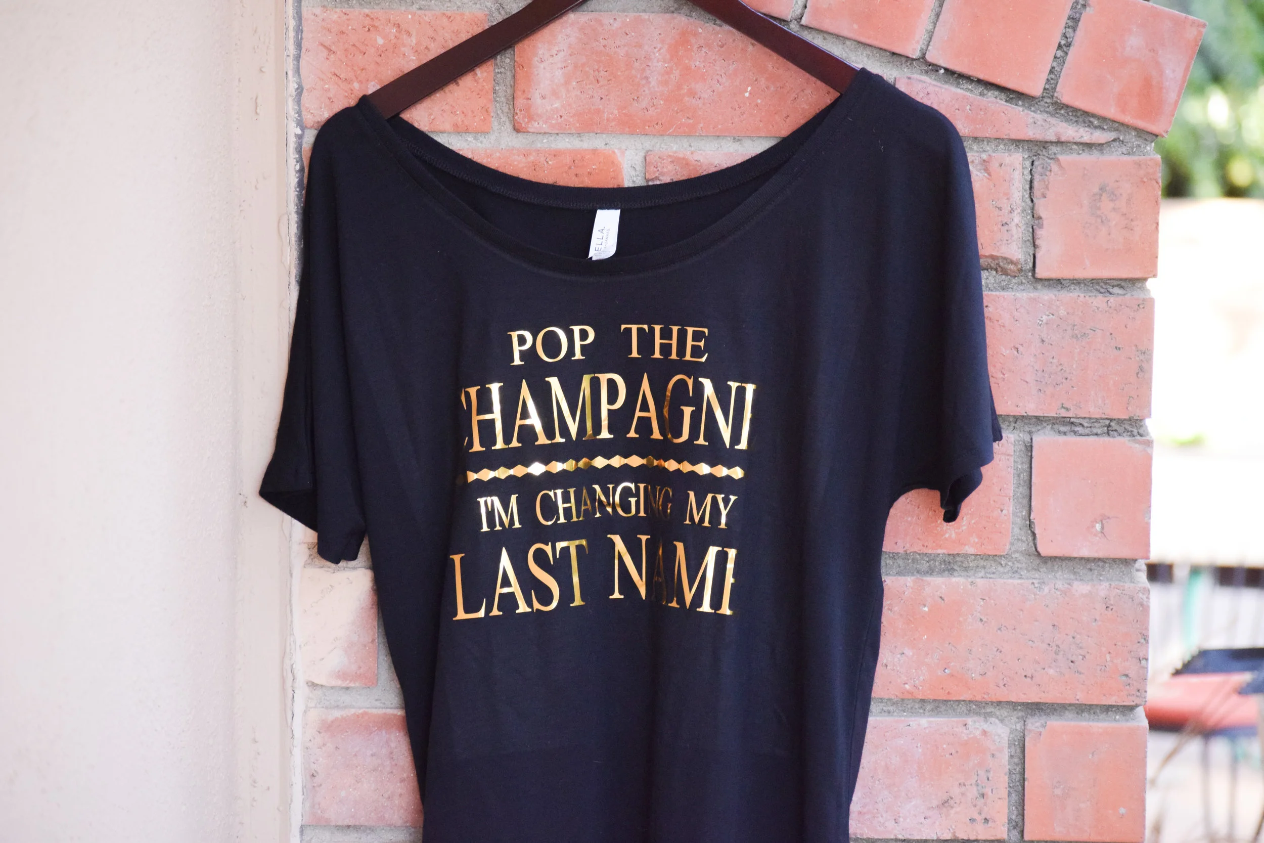 Bride to Be T Shirts - Bride Off the Shoulder Shirt - Pop the champagne, I'm changing my last name!