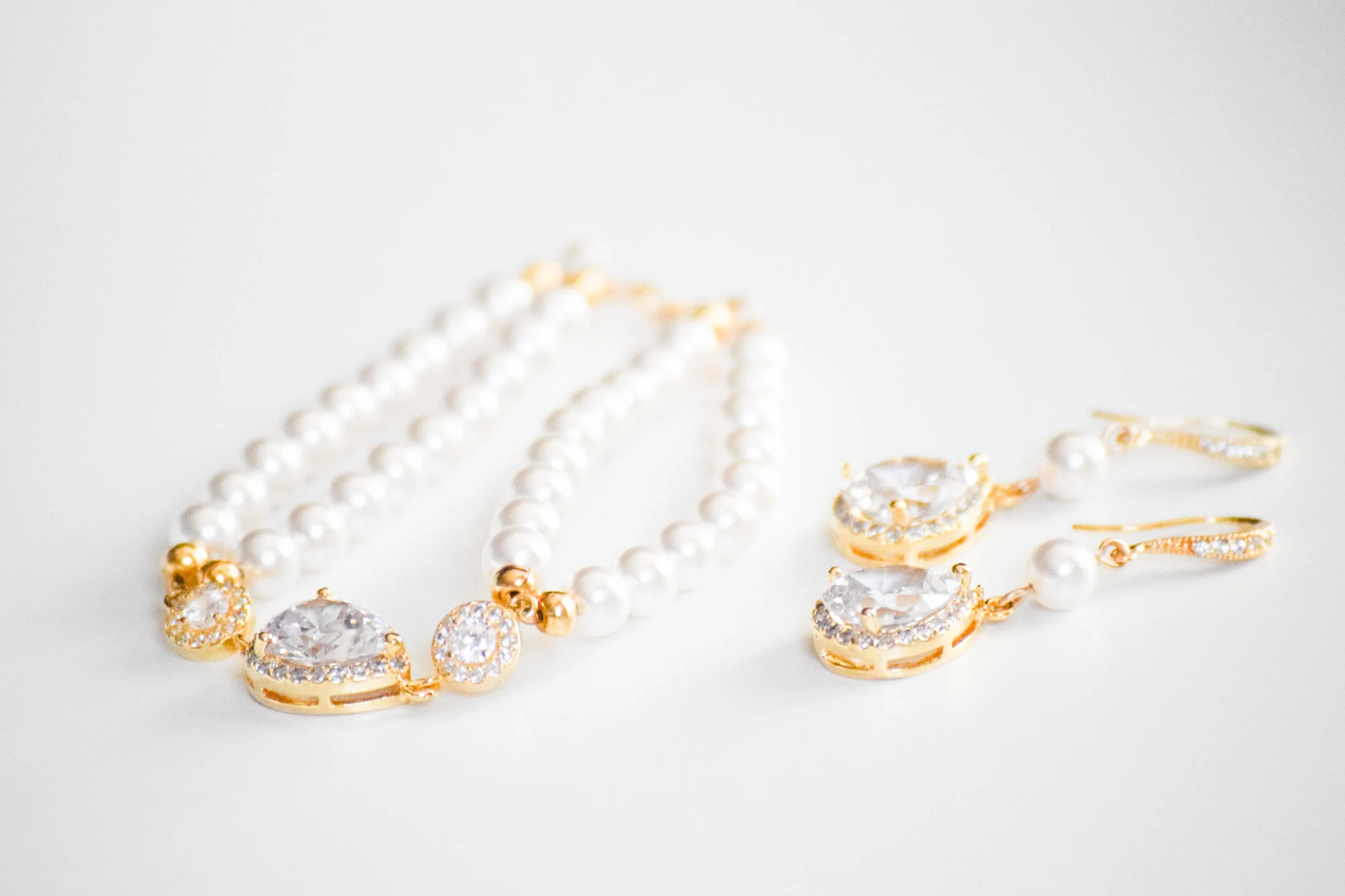 Every bride deserves to look and feel like a princess on her wedding day, so those gorgeous bridal accessories are an essential piece to her overall look! And today we're showcasing the most gorgeous gold and pearl bridal earrings and bridal bracelet set from Estylo Jewelry that's sure to make your guests and your groom swoon as soon as they see you! And it won't break the bank either, so that's always a plus.