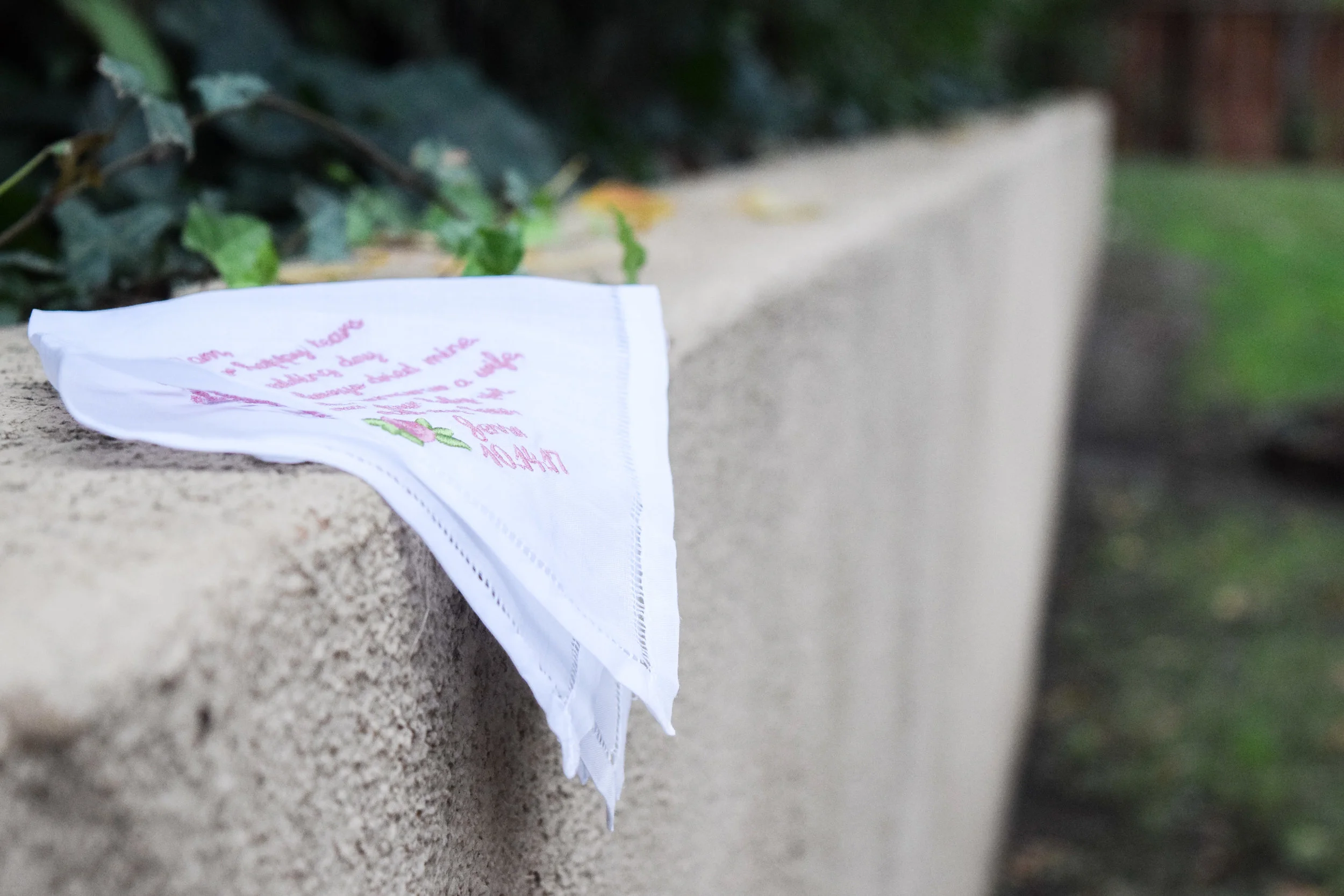 No matter what you choose to write and who you choose to give it to, speak from the heart and you're sure to make that special someone smile. Customize your wedding handkerchiefs from Inspired Stitches at the link below and scroll down to see a gorgeous example.