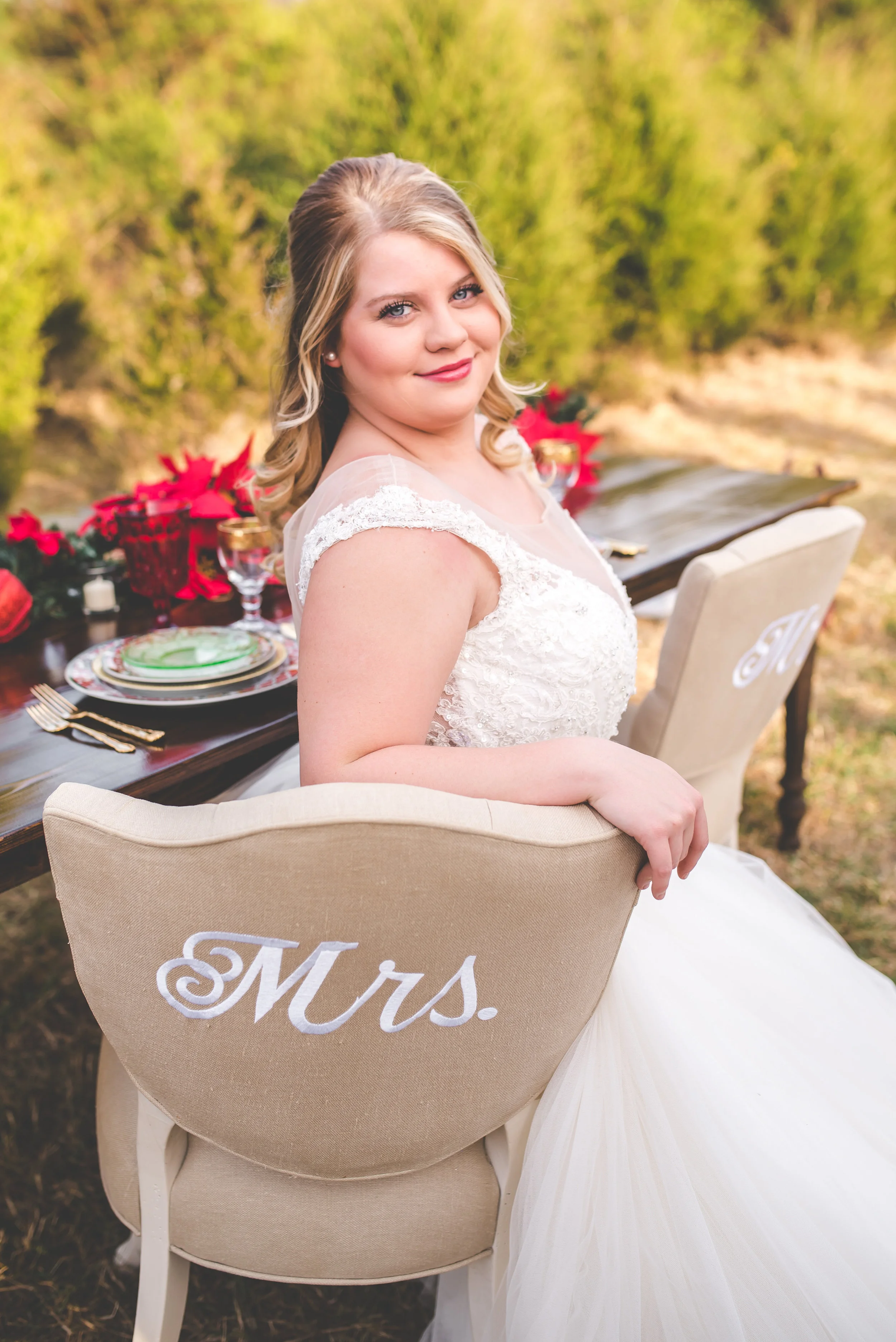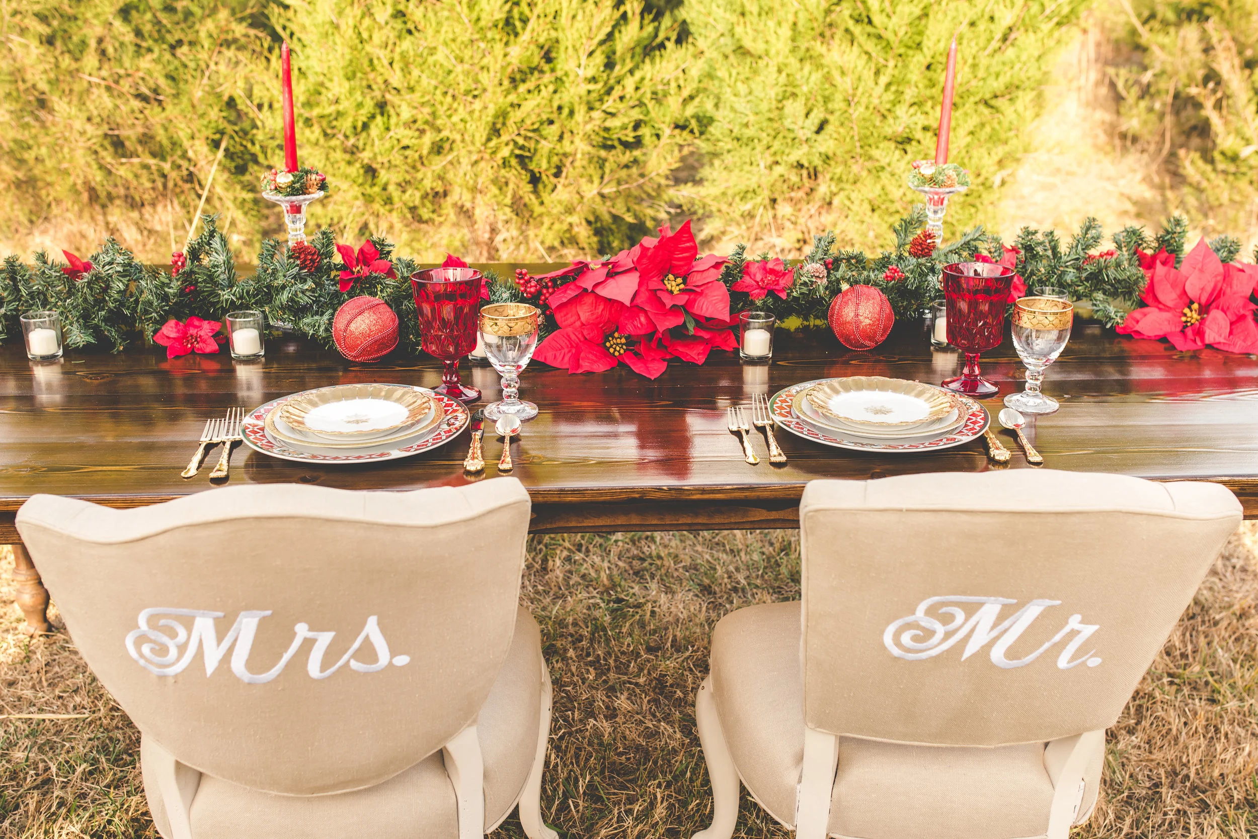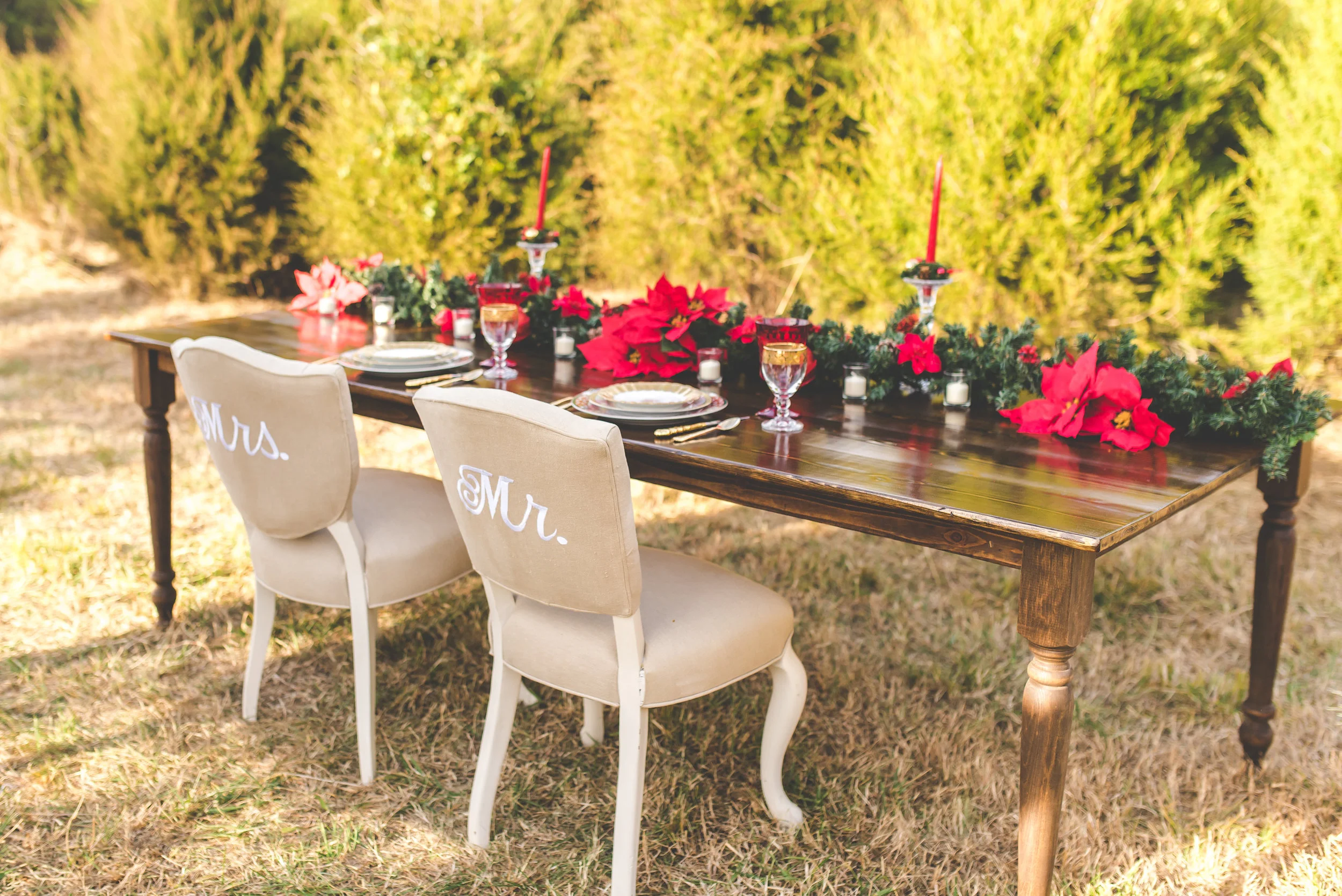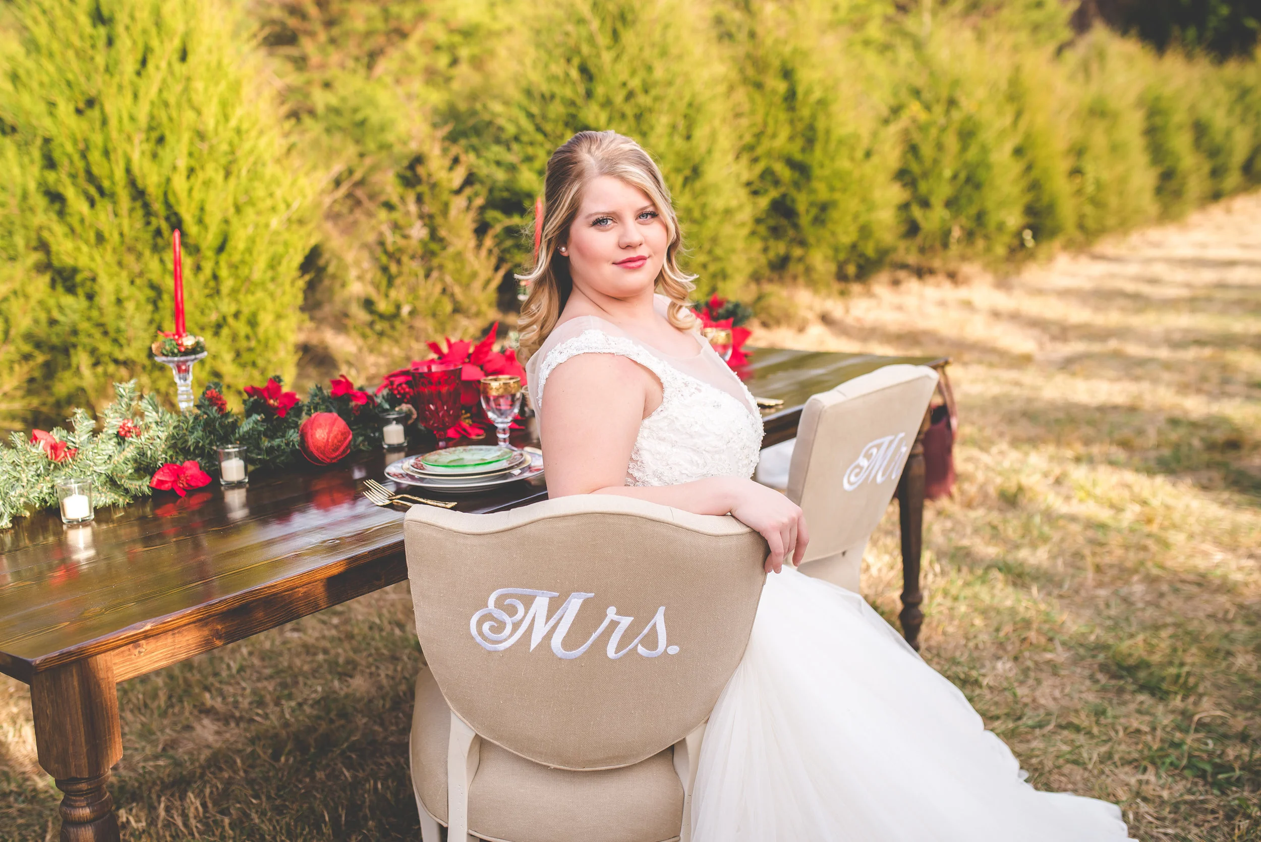 Set in the tranquility of a North Carolina Christmas tree farm during the golden hour of sunset, this shoot is the epitome of a perfect Christmas in the Carolinas. The vast number of pine and fir trees created a picturesque backdrop for both the decorated table and the beautiful bride. The dark, southern farm table was adorned with classic Christmas garlands that included poinsettia flowers, red berries, and sparkling pine cones, along with a variety of candles to set the mood for a quaint, romantic table. Accompanying the decor were varying pieces of red, green, and gold china and glassware that brought an elegant formality to the table. Finally, two sweetheart chairs, embellished with "Mr." and "Mrs." embroidery, were placed at the table, making it the perfect setup for a couple in love.