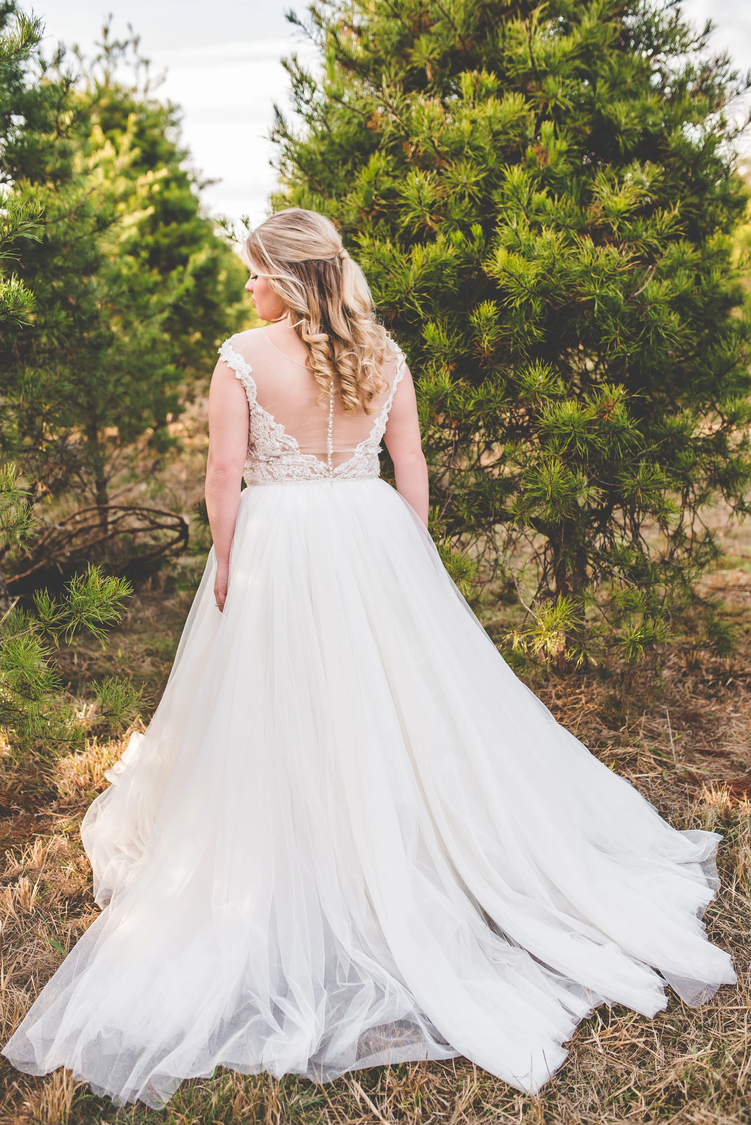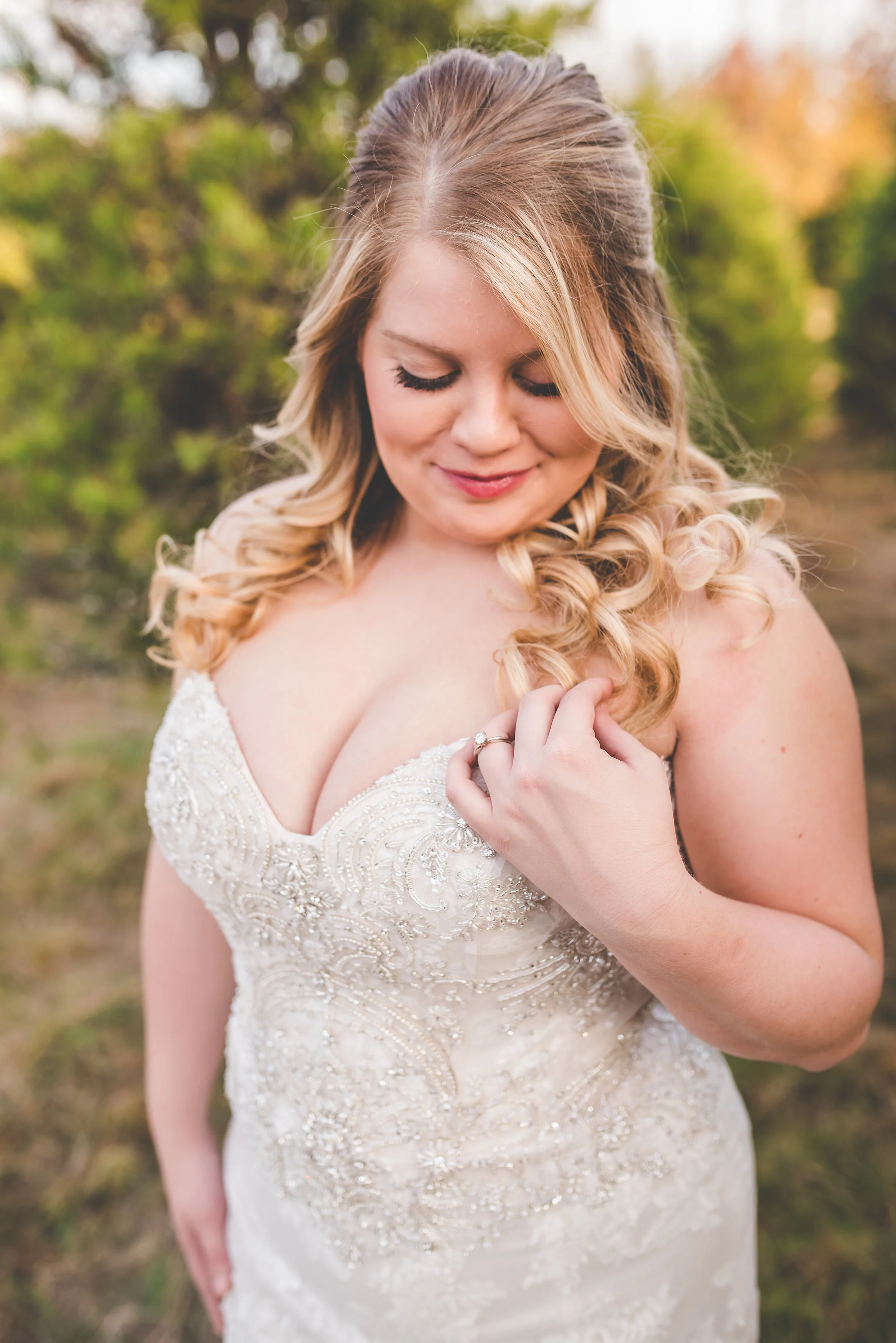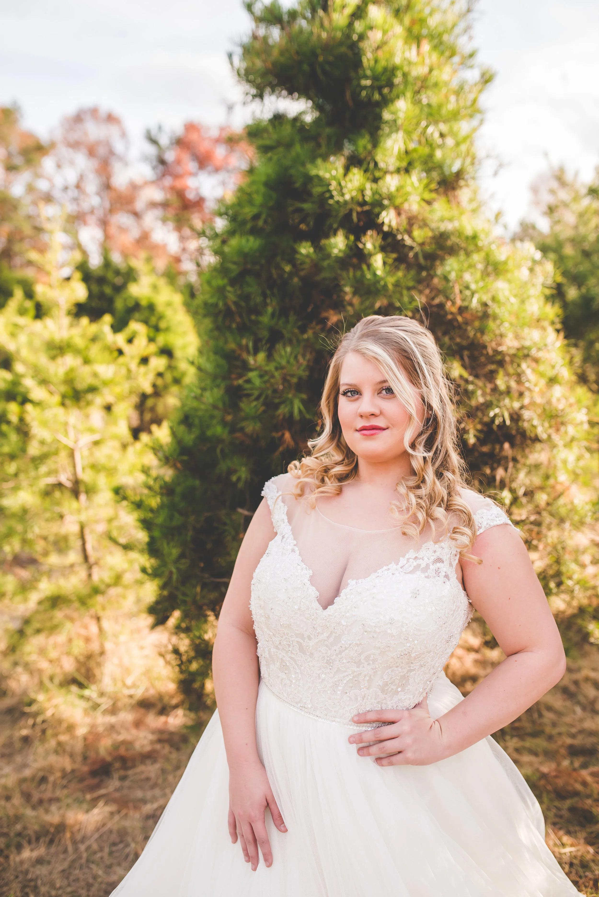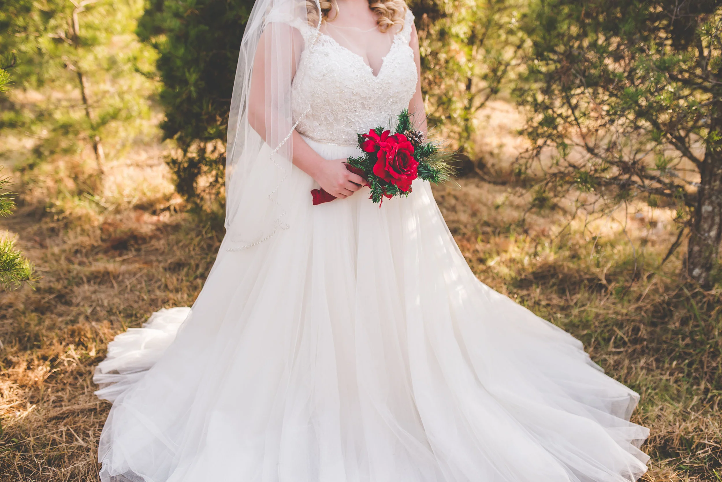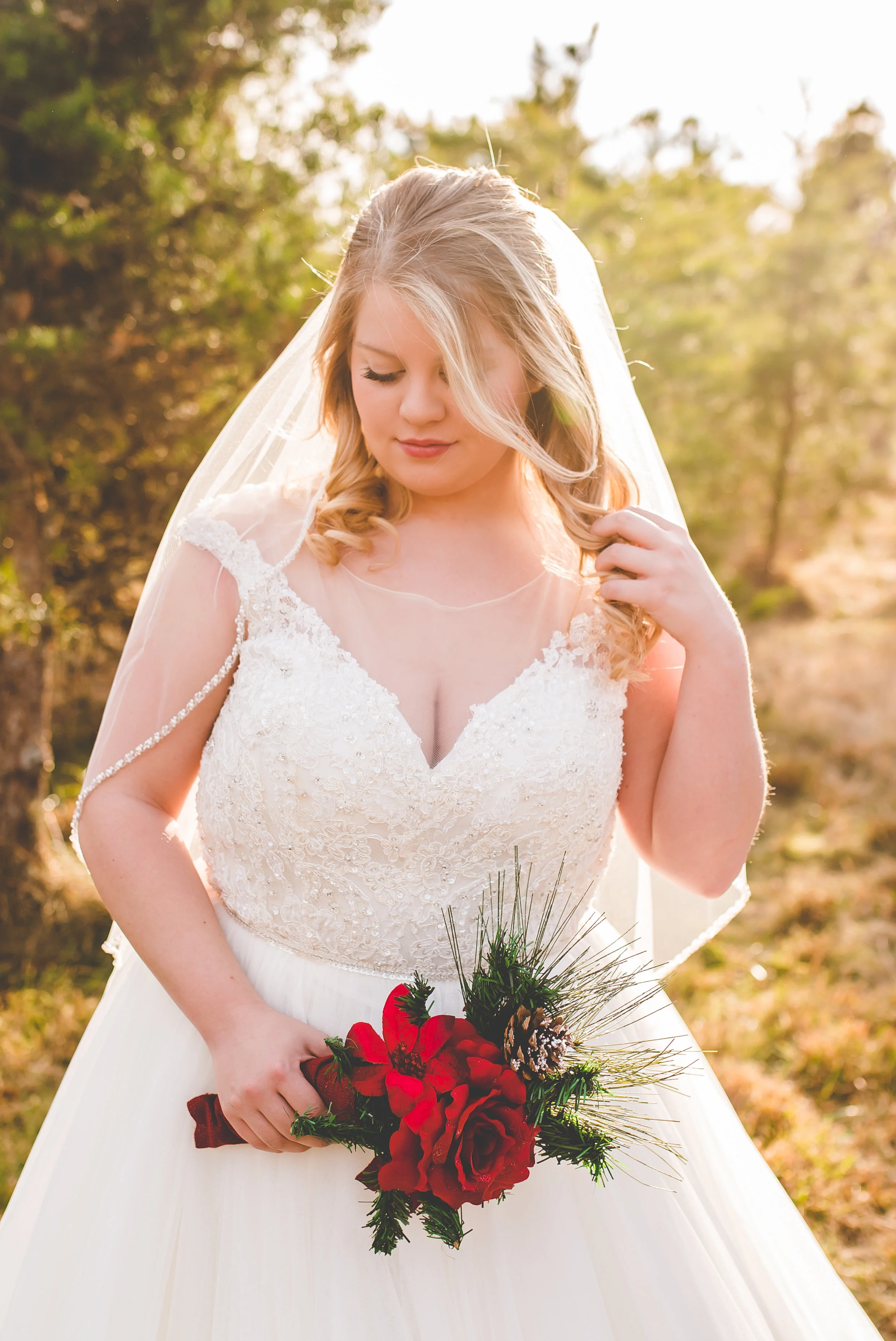 The bride, Lauren, in true southern belle fashion, started out in a romantic Watters ball gown with an illusion sweetheart neckline and just a hint of glamour. Lace and subtle sequins covered the bodice, while flowing ivory tulle draped the skirt. She accented the gown with a simple, curled hairstyle, red lipstick, and pearl earrings, along with a small bouquet of a single red rose, arranged with poinsettia flowers, pine cones, and greenery. To escape the winter chill, Lauren wrapped in a cozy blanket scarf, while showcasing her flawless, solitaire diamond ring. She then changed into a second gown, a crystal-covered Casablanca A-line with a sweetheart neckline, to add a little extra flair to the fairytale setting. The day ended with the sunset, leaving everyone even more excited about Christmas in the Carolinas.