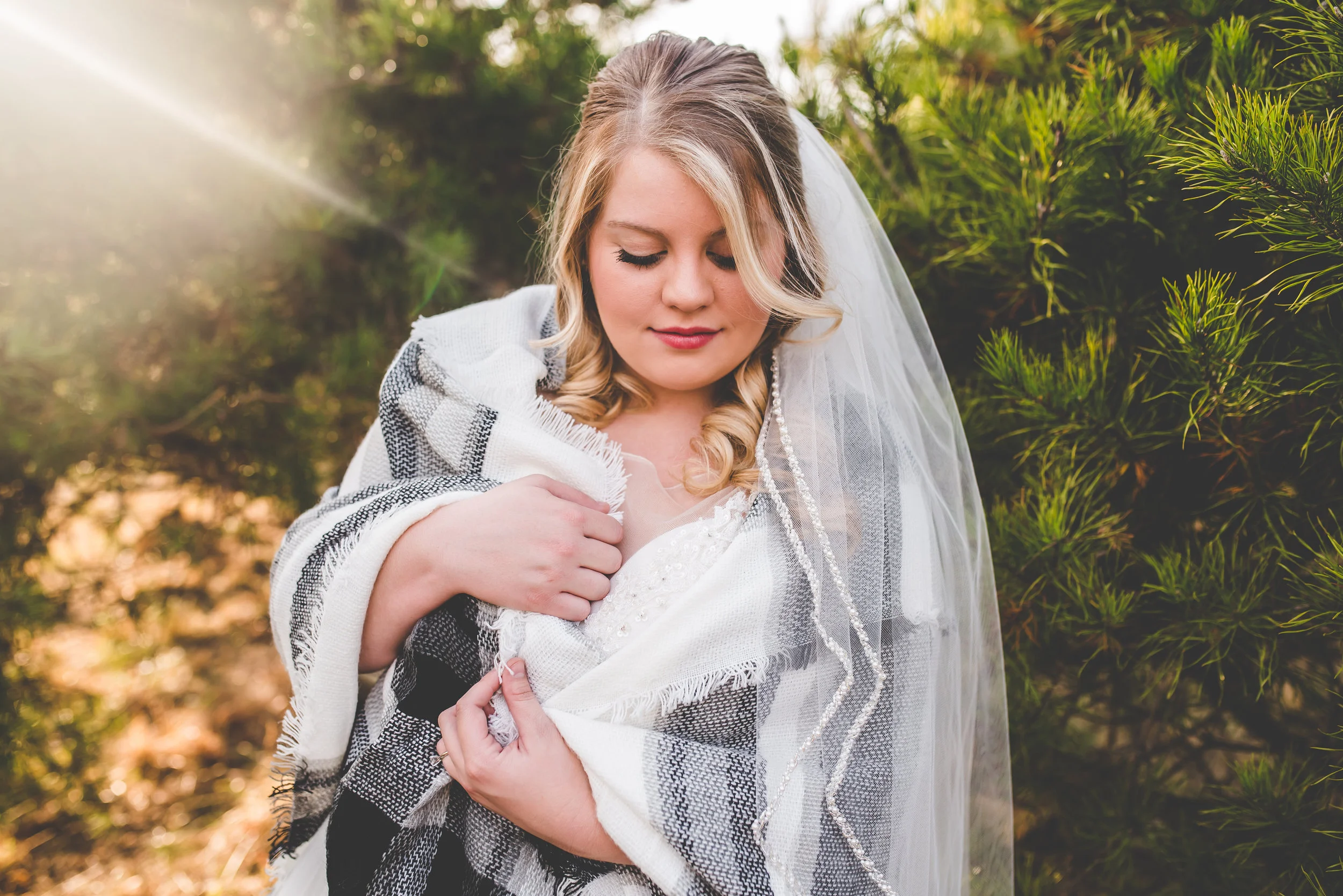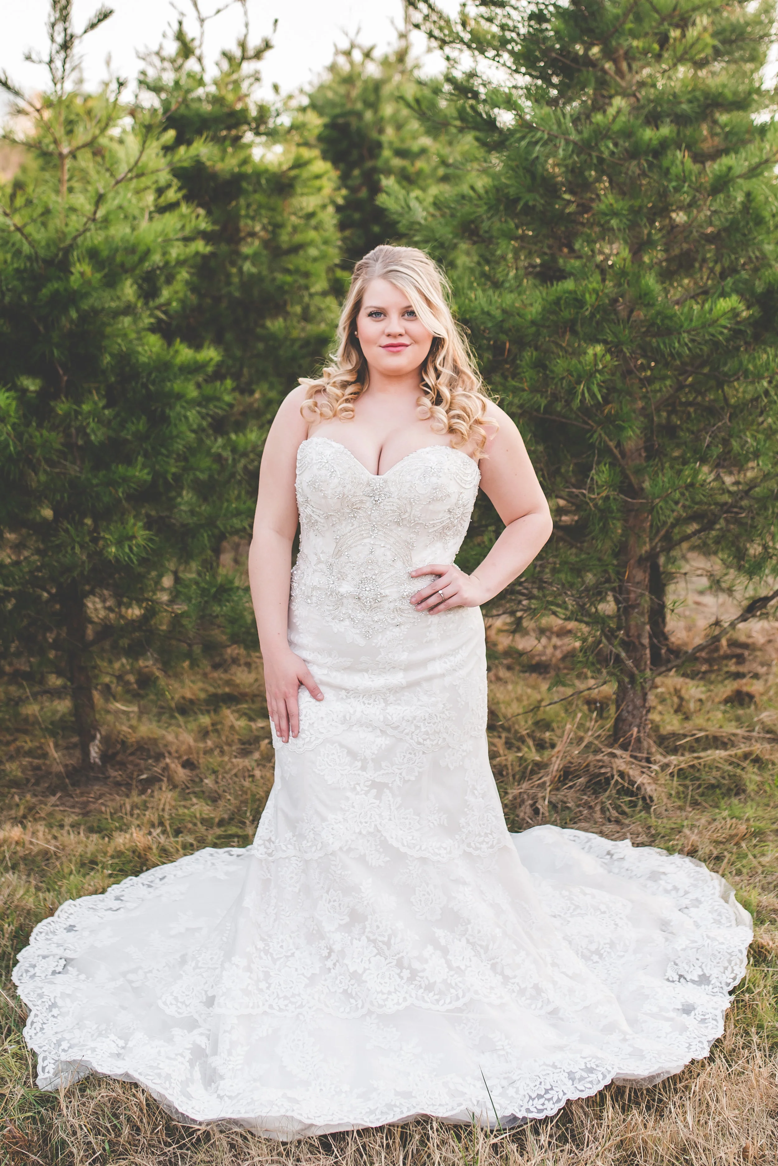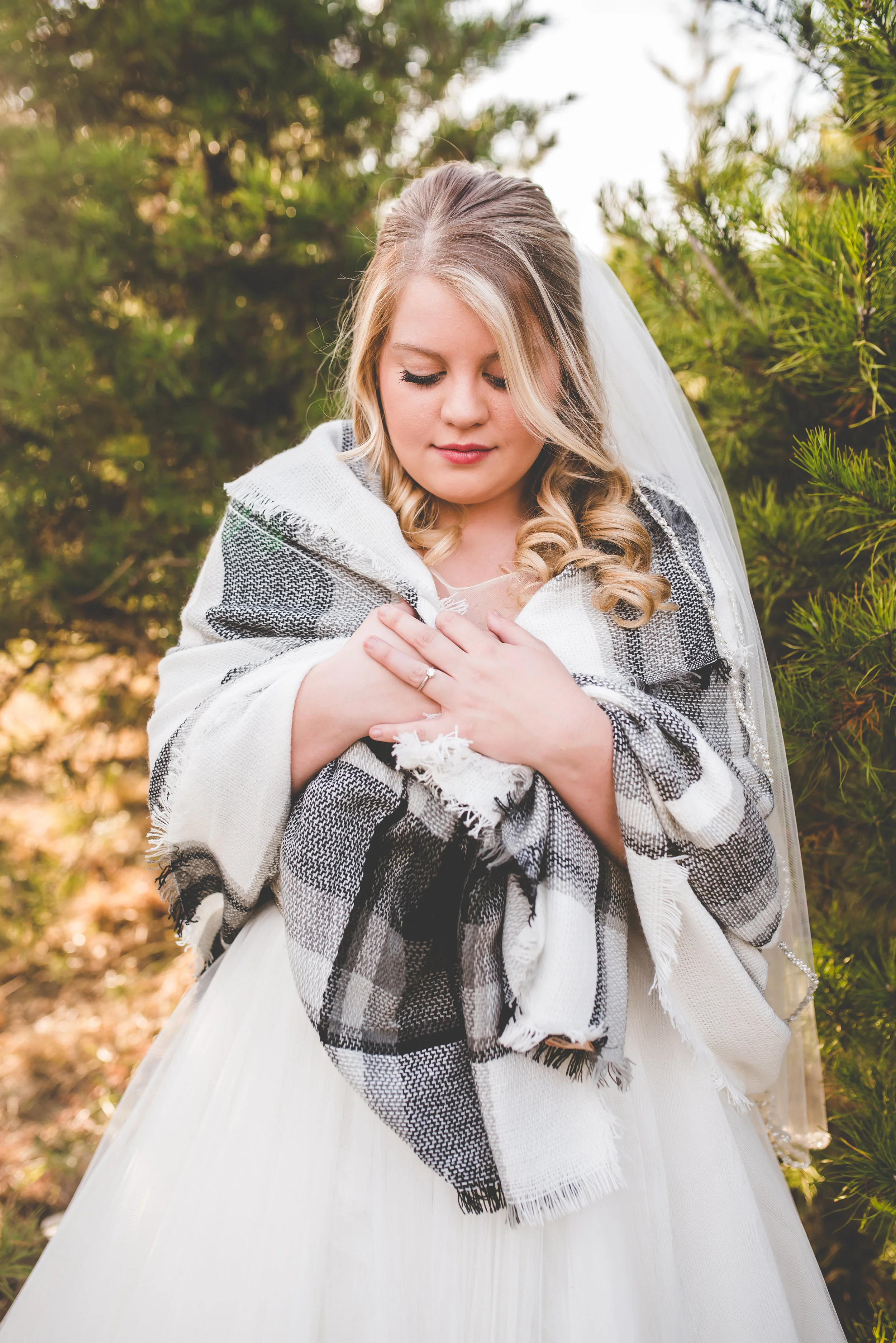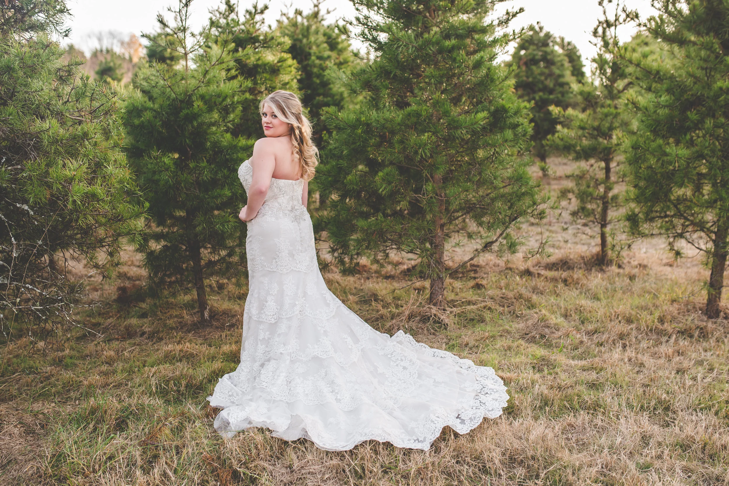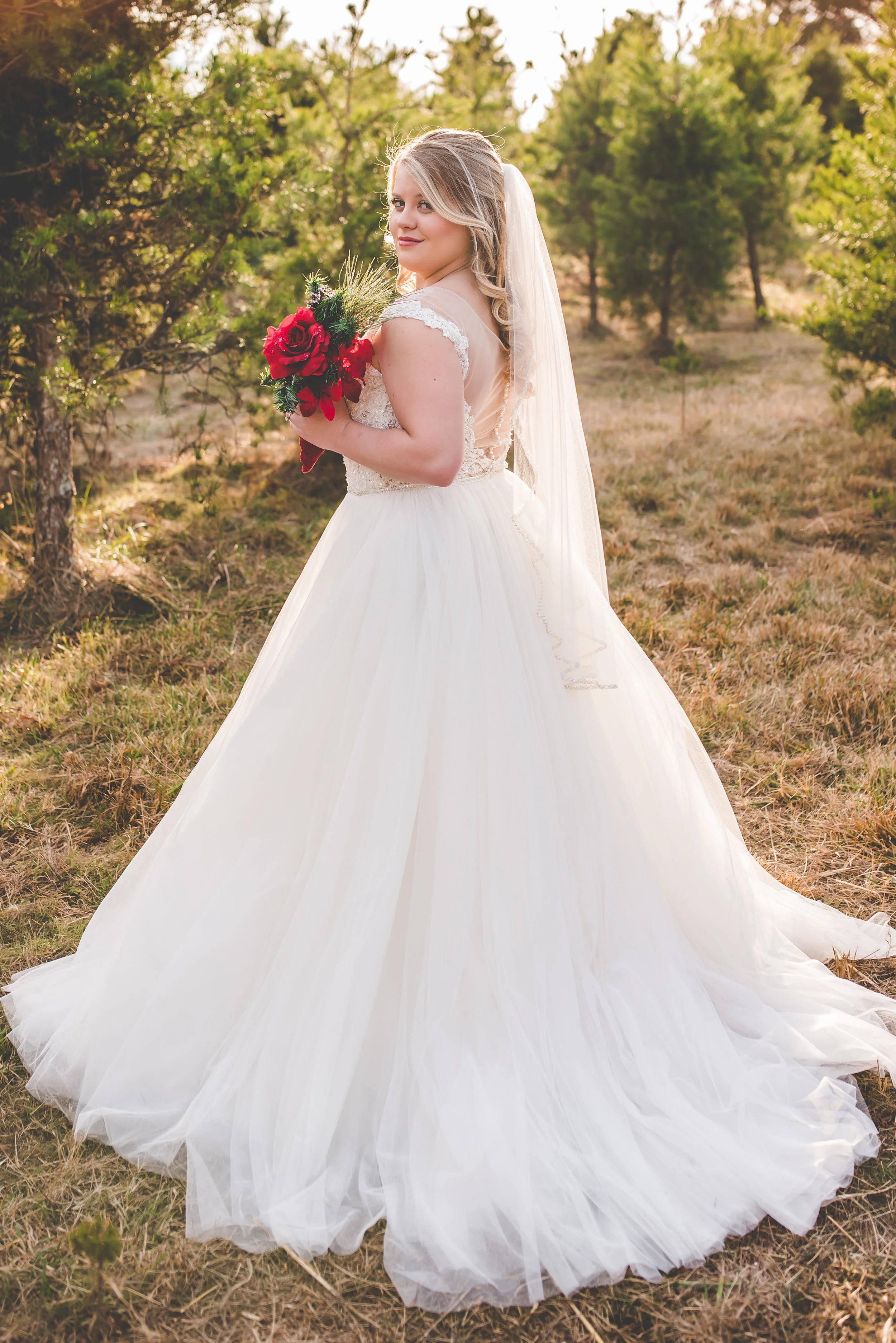 The bride, Lauren, in true southern belle fashion, started out in a romantic Watters ball gown with an illusion sweetheart neckline and just a hint of glamour. Lace and subtle sequins covered the bodice, while flowing ivory tulle draped the skirt. She accented the gown with a simple, curled hairstyle, red lipstick, and pearl earrings, along with a small bouquet of a single red rose, arranged with poinsettia flowers, pine cones, and greenery. To escape the winter chill, Lauren wrapped in a cozy blanket scarf, while showcasing her flawless, solitaire diamond ring. She then changed into a second gown, a crystal-covered Casablanca A-line with a sweetheart neckline, to add a little extra flair to the fairytale setting. The day ended with the sunset, leaving everyone even more excited about Christmas in the Carolinas.