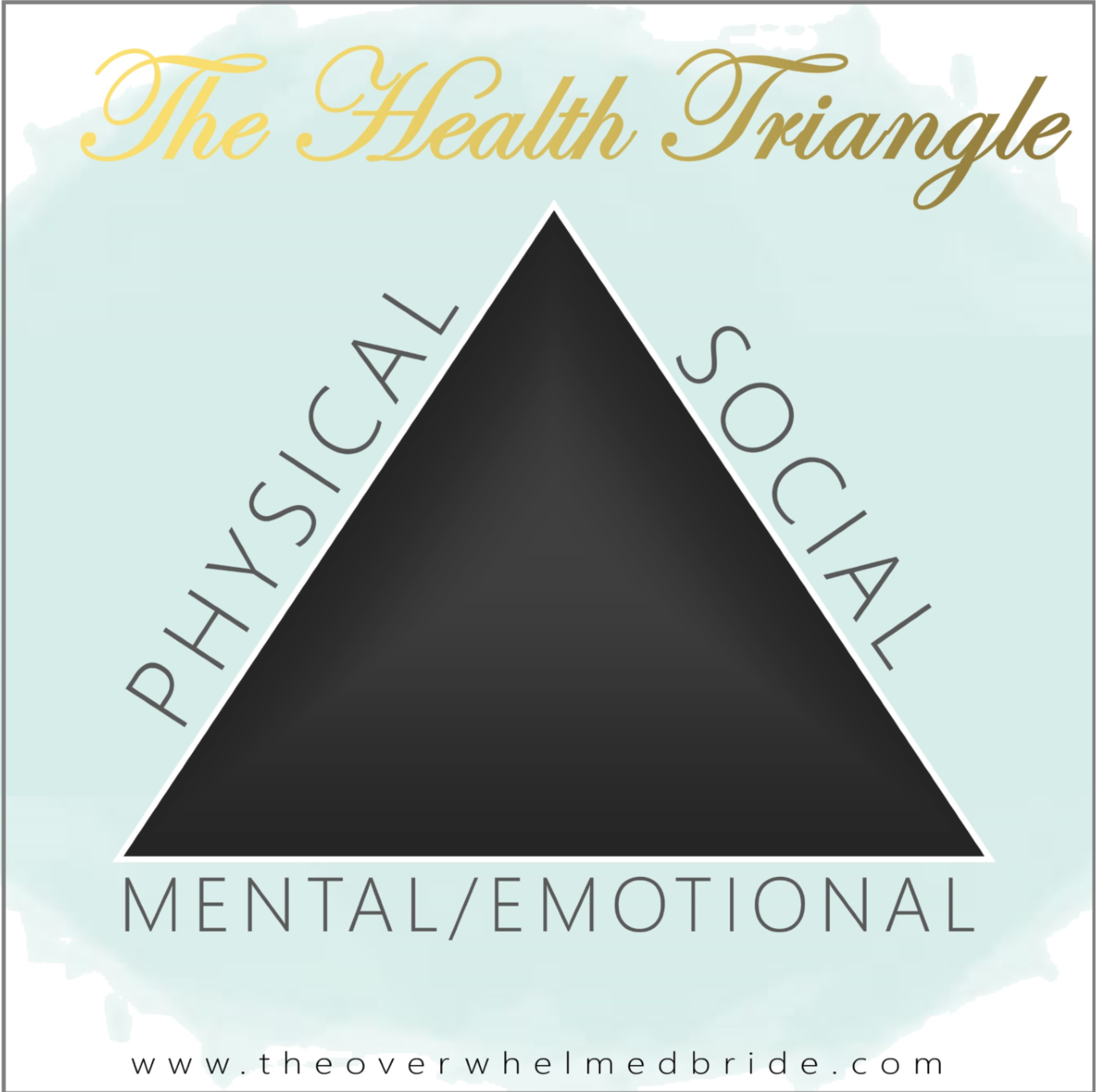 Around middle school, children are usually required to take a health class. In this health class they may learn about the Health Triangle. The health triangle is an illustration to show how we must be balanced in every aspect in order to lead a healthy life. The three sides to the equilateral triangle are physical health, social health, and mental/emotional health. As we grow older and take on more responsibilities, sometimes this triangle with “equal” sides becomes more distorted. We may hit the gym every day and try to eat clean and healthy, but outside of the gym are stressed out because of work and family. Or, we may take so much time helping others, for example our children, an elderly parent, our spouses, etc. that we don’t find time to fit in the physical aspect of our health. In the long run, each part of the health triangle actually goes hand in hand.