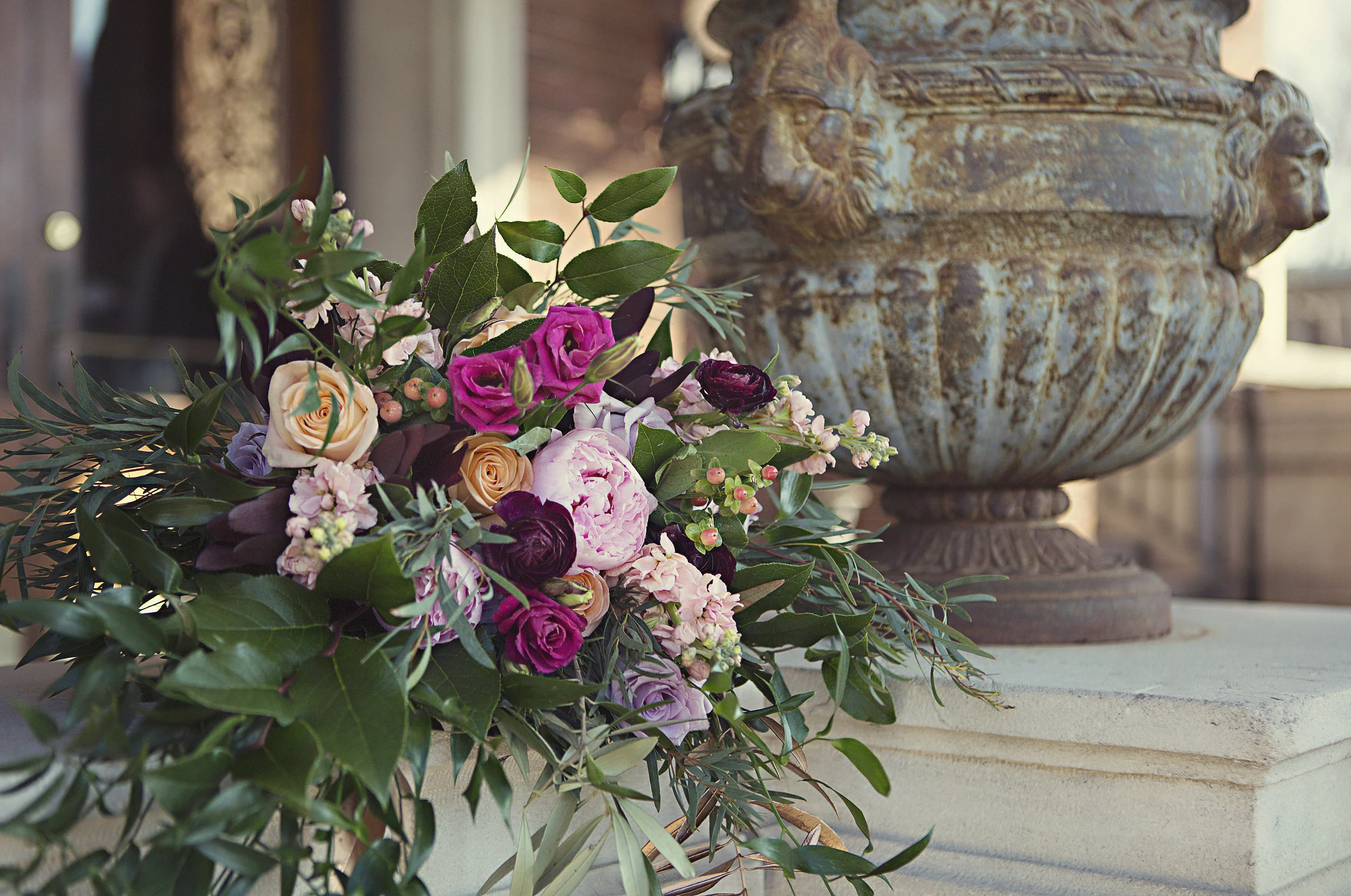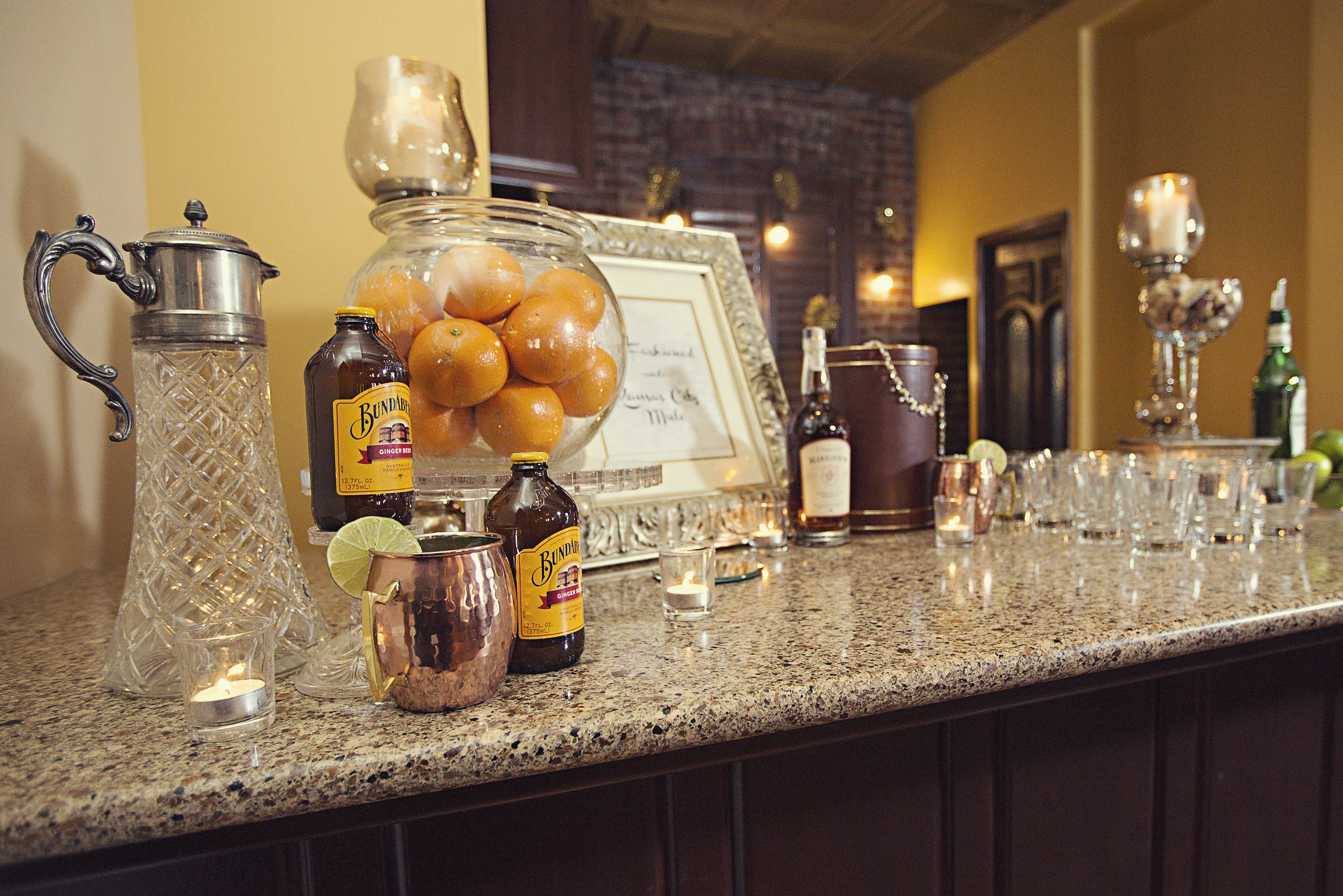 Tables are adorned with Loose Mansion’s vintage flatware and glassware, and over-flowing blooms from Good Earth Floral. Hues of purple and pink among gorgeous greenery are the perfect complement to this space’s warmer aesthetic. The speakeasy style bar was designed in a way that would provide pops of our couple’s signature details while still being functional for thirsty friends and family. Complete with multiple lounge areas showcasing vintage pieces found among the mansion’s treasures, this ideal rehearsal dinner provides a relaxed atmosphere without taking away from the beauty of a traditional sit-down meal with loved ones.