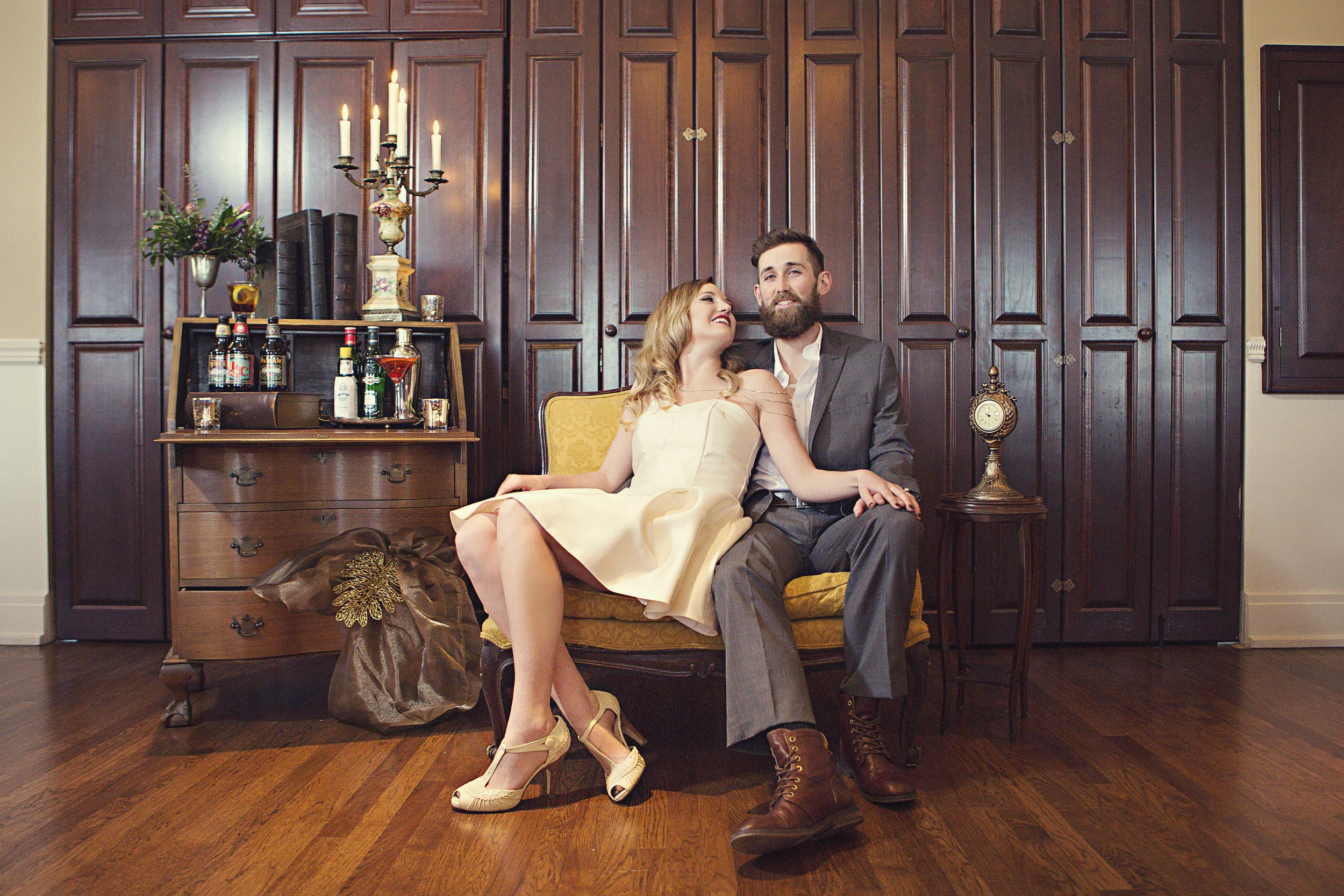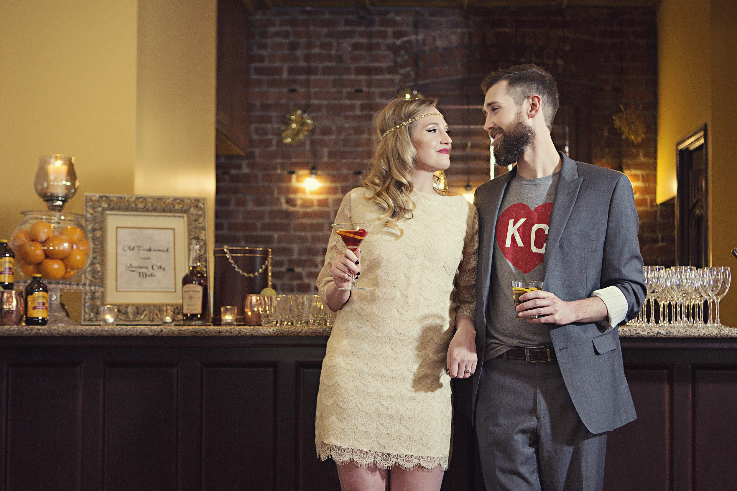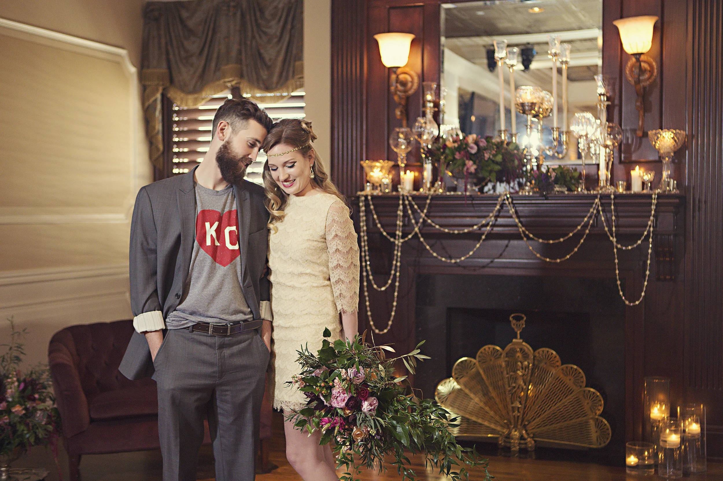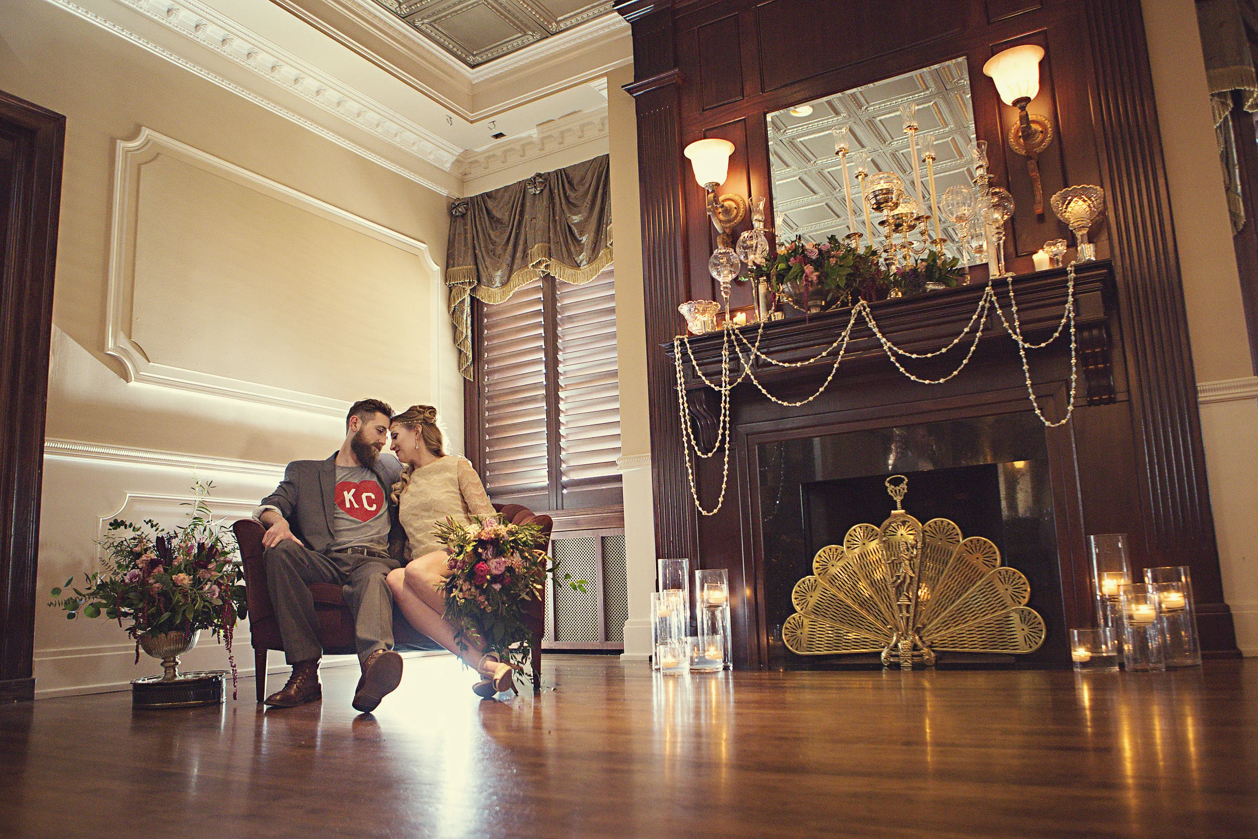 The timeless beauty of Loose Mansion is the perfect setting inside and out for those with a deep appreciation for Kansas City’s history and well-designed events. This shoot should inspire couples to enjoy their last eve before the big vow exchange in a way that showcases them as individuals, and celebrates their hometown and love for each other. Our gorgeous bride-to-be is styled in simple yet stunning cocktail dresses with trendy accessories from Altar Bridal that are sure to have any gal glowing. Our groom sets the mood throughout the evening with his dapper vibe whether wearing his perfectly tailored suit, or his favorite Charlie Hustle tee.