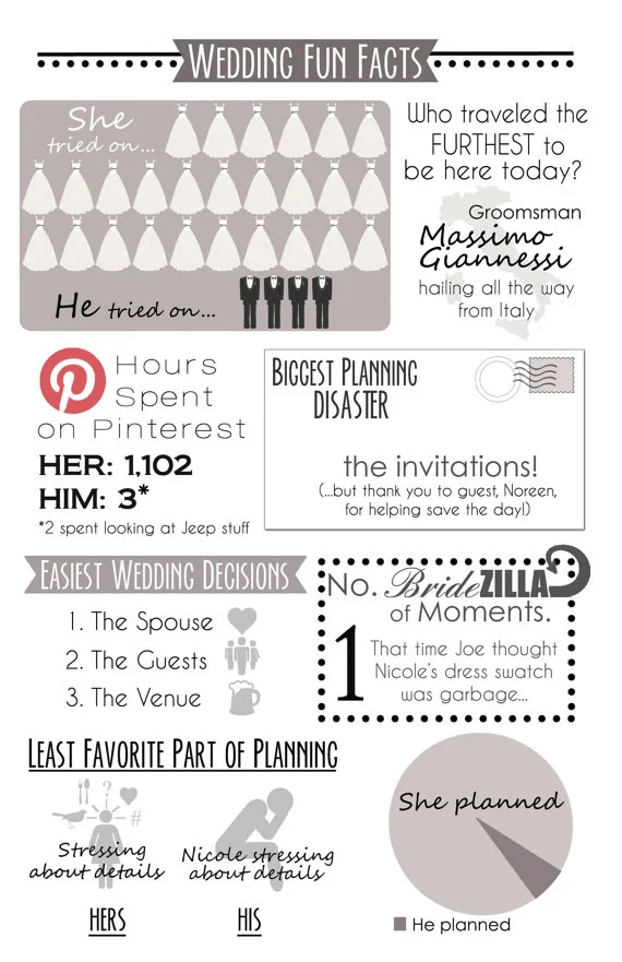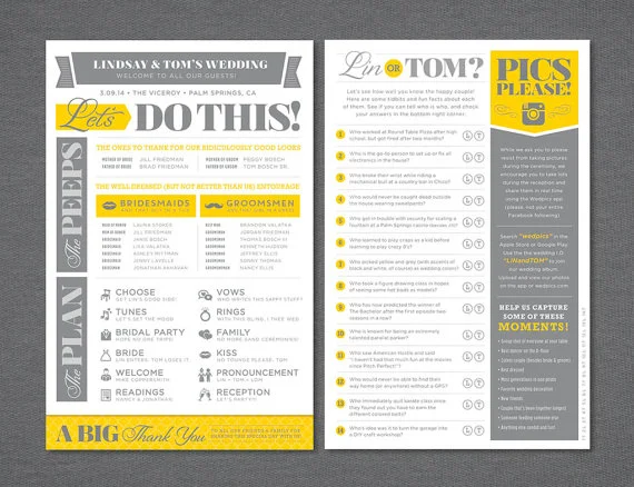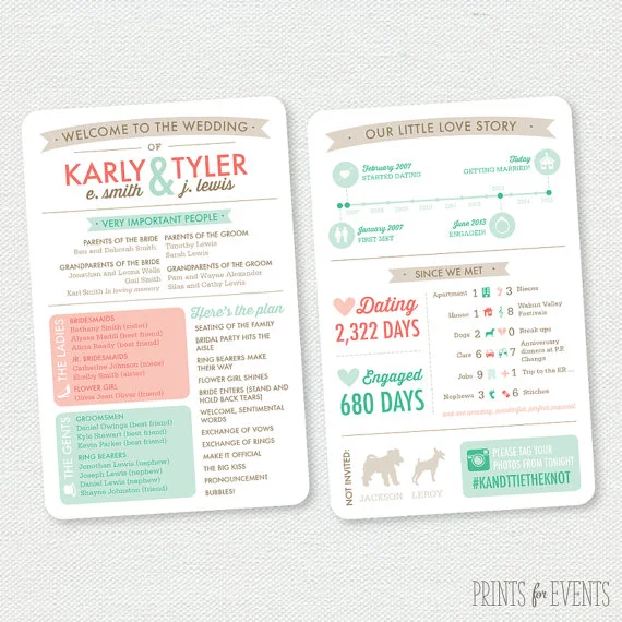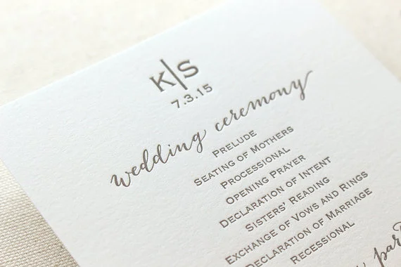 Many couples decide against wedding ceremony programs because they believe they are boring and are just going to get tossed out. And while I do support that in some cases, they don't always have to be boring and can be a great keepsake for you and your wedding guests! So choose some unique wedding programs that your guests will actually enjoy and at the end of the ceremony, I bet there will be far less ending up in the trash.