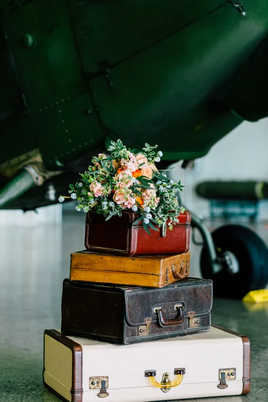 With a variety of different planes to choose from, we wanted to show off the unique features of each one and utilized a variety off props from many different rental companies to accent those different planes and spaces within the museum. Encouraging all of the vendors involved to get creative allowed for all sorts of fun things to happen: a flower filled hot air balloon, an amazing "worldly" cake and some especially fun paper pieces. We brought in vintage suitcases and personal touches from Whitley's family as well. It was certainly a fun theme to work with and watching plans fly in and out of the museum all day just made it all that much more real!